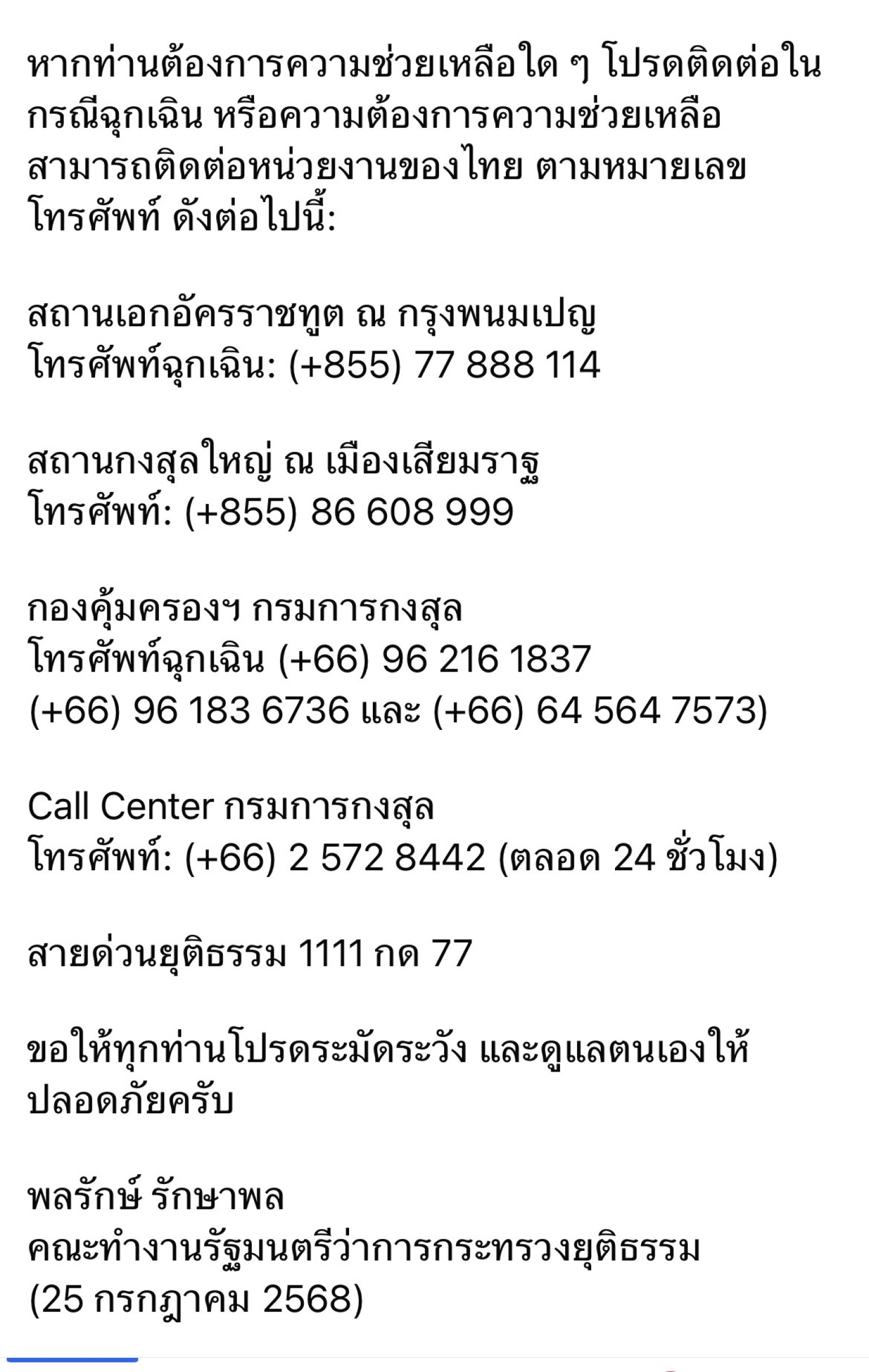 เมื่อวันที่ 25 ก.ค.68 นายพลรักษ์ รักษาพล คณะทำงานรัฐมนตรีว่าการกระทรวงยุติธรรม โพสต์ข้อความผ่านเฟซบุ๊กส่วนตัว "Palrak Raksaphol" ระบุว่า ถึงประชาชนชาวไทยที่รักทุกท่าน