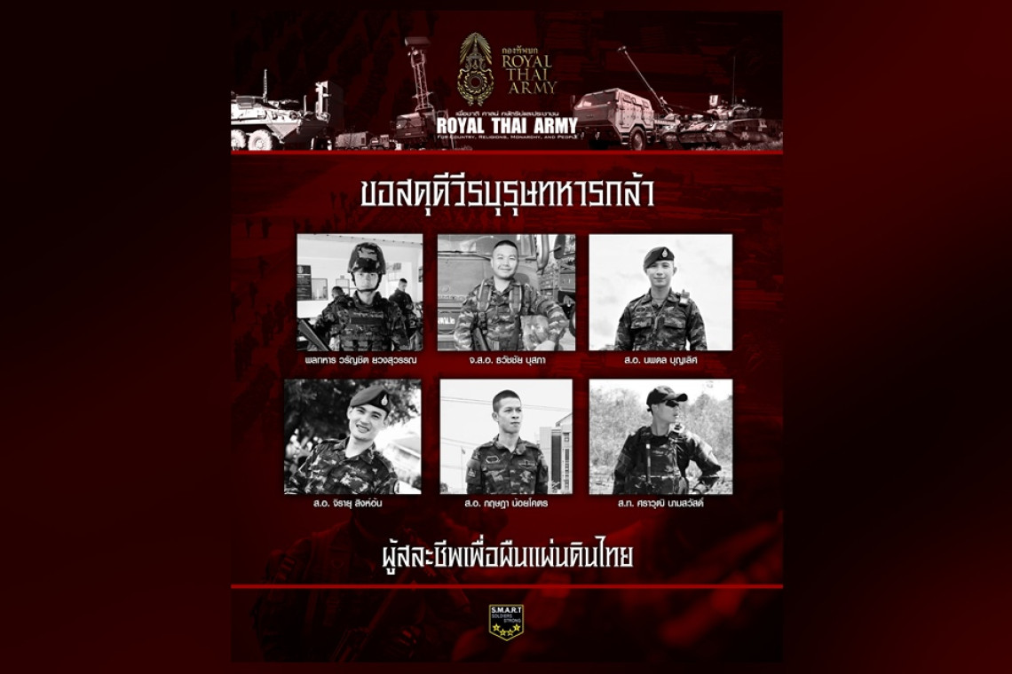 วันที่ 25 ก.ค.68 กองทัพบก สดุดีกำลังพลผู้เสียชีวิตจากการปฏิบัติหน้าที่ปกป้องอธิปไตยของชาติ โดยระบุข้อความว่า การเสียสละของทหารกล้าจะถูกจารึกไว้ในความทรงจำของผู้ร่วมรบ และจะสถิตอยู่ในหัวใจของทหารทุกนายตลอดไป จากเหตุการณ์ปะทะบริเวณชายแดนไทย–กัมพูชา เมื่อวันที่ 24–25 กรกฎาคม 2568 กำลังพลจากกองทัพภาคที่ 2 ซึ่งปฏิบัติหน้าที่อย่างกล้าหาญในการพิทักษ์อธิปไตยของชาติ ได้เสียชีวิตจากการปฏิบัติภารกิจด้วยความกล้าหาญและเสียสละ จำนวน 6 นาย ได้แก่