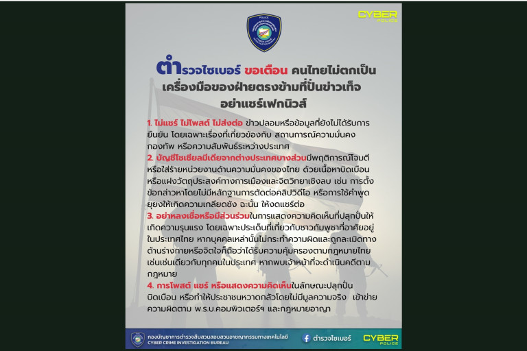 #ตำรวจไซเบอร์ #CyberPolice #เหตุปะทะชายแดน #หยุดแชร์ข่าวปลอม #ไม่เชื่อไม่แชร์ #FakeNews #เฟกนิวส์ #ข่าวปลอมบ่อนทำลายชาติ #บชสอท #ไทยกัมพูชา #สงบเรียบร้อยของสังคม #หยุดบิดเบือน