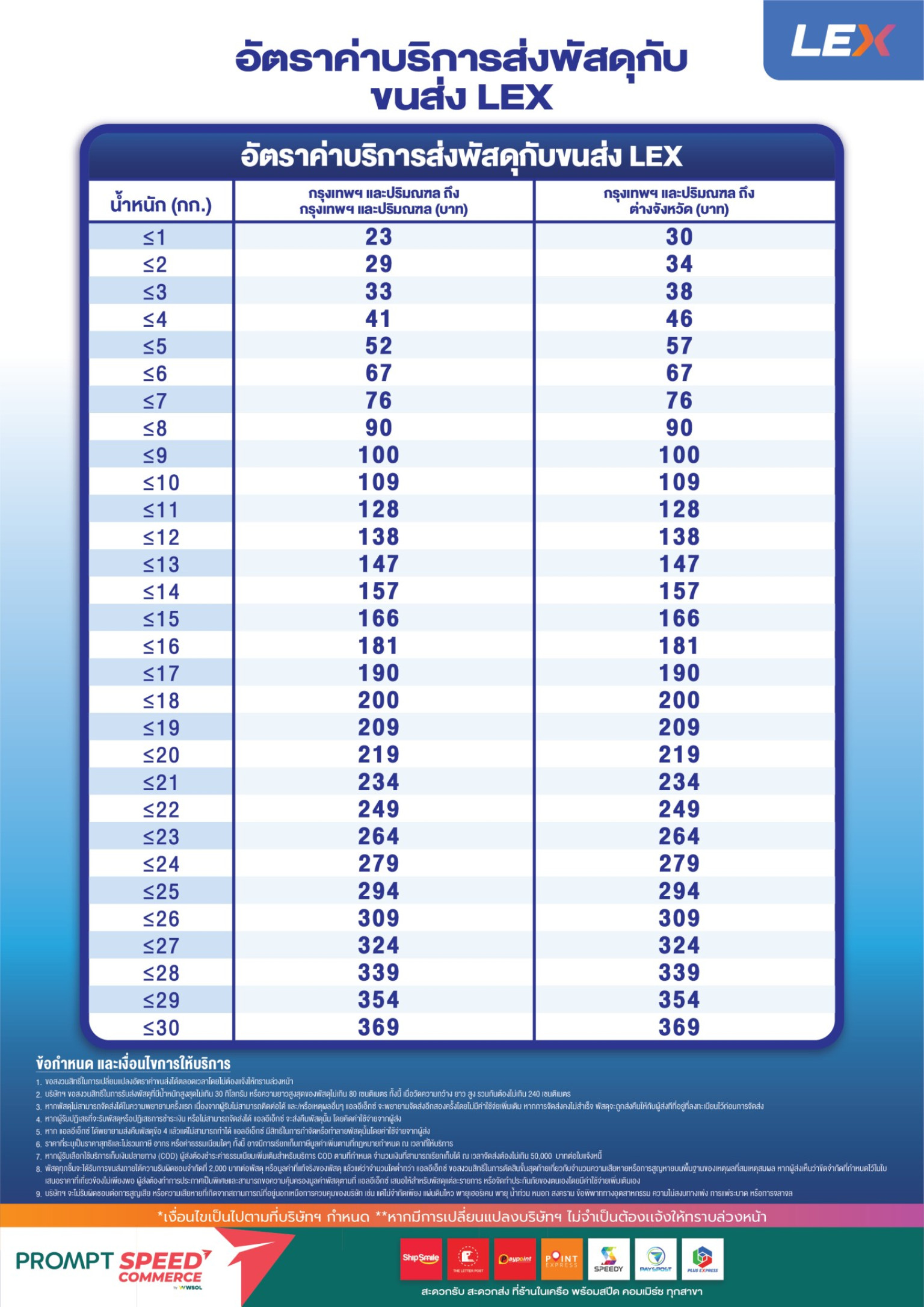 1. บริการจัดส่งพัสดุภายใน 1 - 3 วัน ในอัตราค่าบริการเริ่มต้นเพียง 23 บาท รองรับน้ำหนักได้สูงสุด 30 กก. และความยาวของกล่องรวมกันไม่เกิน 240 ซม.