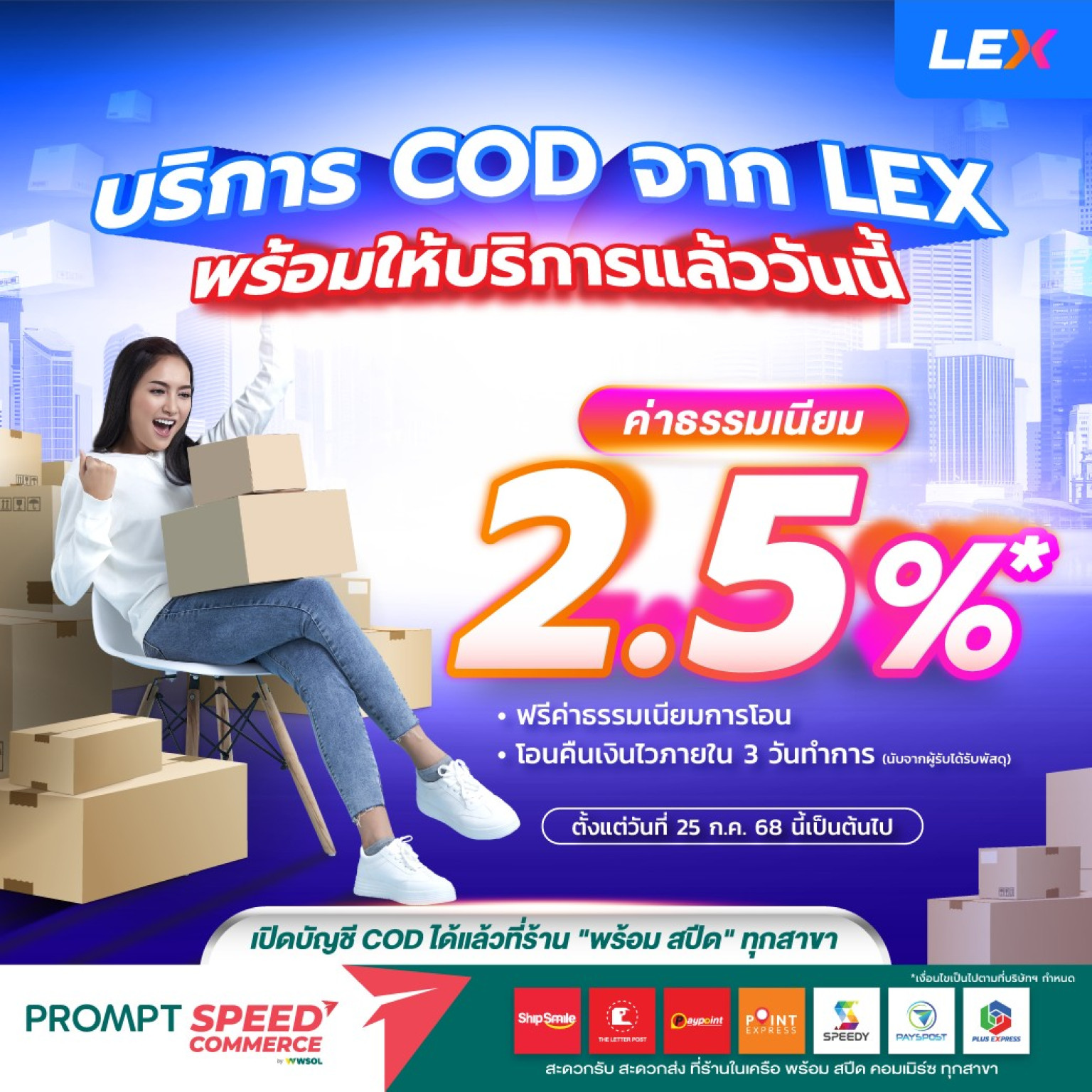 WSOL ดัน พร้อมสปีด คอมเมิร์ซ ผู้ให้บริการแฟรนไชส์ร้านร่วมขนส่งในฐานะ 4PL (Fourth-Party Logistics) ยกระดับบริการขนส่งครบวงจร จับมือพันธมิตรยักษ์ใหญ่ LEX (Lazada Express) ให้บริการจัดส่งพัสดุบนสาขาเจ้าแรกในประเทศ เสริมศักยภาพการขยายจุดให้บริการส่งพัสดุ และบริการเก็บเงินปลายทาง คาดเปิดให้บริการจุดดรอปพัสดุจากแพลตฟอร์ม Lazada เพิ่มเติมในไตรมาส 4 นี้ รองรับการให้บริการกว่า 27,000 สาขา ทั่วประเทศ ตอกย้ำเป้าหมายศูนย์รวมขนส่งครบวงจรอันดับหนึ่งของไทย รองรับตลาดอีคอมเมิร์ซโตต่อเนื่อง