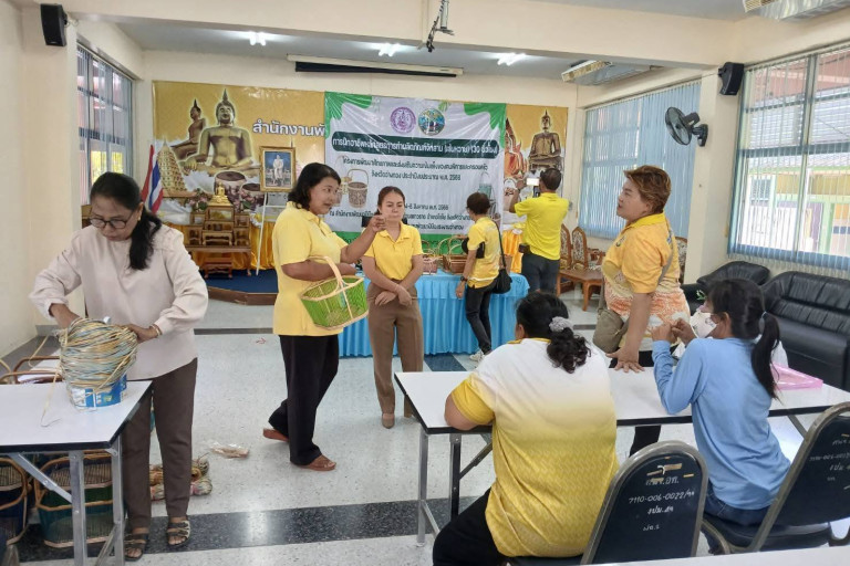 วันที่ 4 สิงหาคม 2568 นายโอภาศ ศรีฉันทะมิตร พัฒนาสังคมและความมั่นคงของมนุษย์จังหวัดอ่างทอง มอบหมายให้ นางสาวกรรณิการ์ วงค์ไชย ผู้อำนวยการศูนย์บริการคนพิการจังหวัดอ่างทอง พร้อมเจ้าหน้าที่ศูนย์บริการคนพิการจังหวัดอ่างทอง ดำเนินการจัดกิจกรรมฝึกอาชีพทำจักสานด้วยเส้นหวายให้แก่คนพิการ ผู้ดูแลคนพิการ และครอบครัวคนพิการ เพื่อฝึกการร้อยเส้นหวาย ตกแต่งตะกร้าหวาย การเลือกเส้นหวาย การขึ้นลายตะกร้า เพื่อพัฒนาอาชีพและสร้างรายได้ให้แก่คนพิการ และครอบครัวคนพิการ จำนวน 20 คน โดยวิทยากรที่รับรองโดยสำนักงานพัฒนาฝีมือแรงงานอ่างทอง ภายใต้โครงการพัฒนาศักยภาพและส่งเสริมความเข้มแข็งของคนพิการและครอบครัวจังหวัดอ่างทอง ประจำปีงบประมาณ พ.ศ. 2568 ในระหว่างวันที่ 4 - 8 สิงหาคม 2568 ณ อาคารฝึกอาชีพ สำนักงานพัฒนาฝีมือแรงงานอ่างทอง ตำบลเทวราช อำเภอเมืองอ่างทอง จังหวัดอ่างทอง