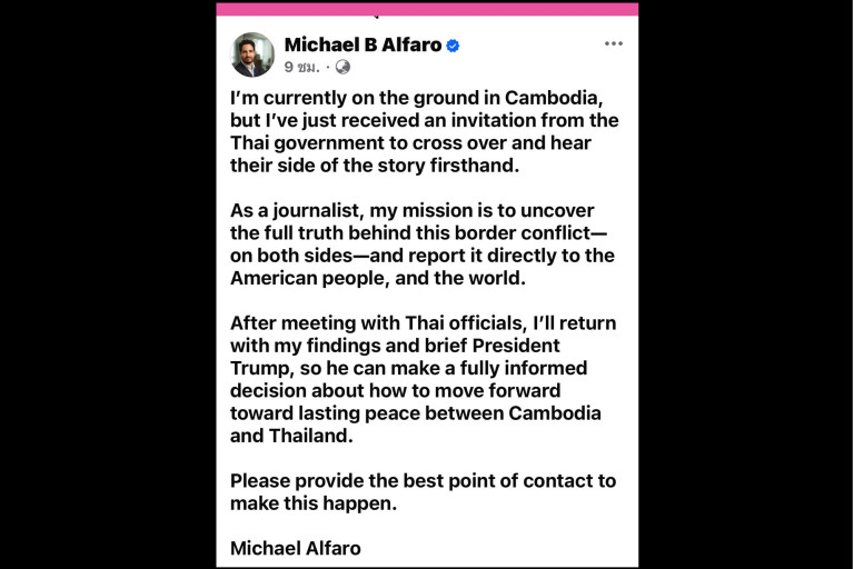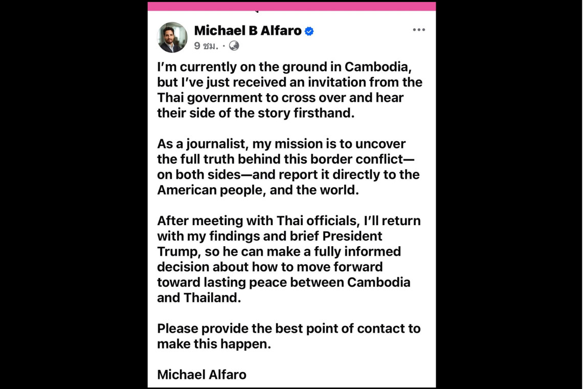 “ไมเคิล อัลฟาโร” ล็อบบี้ยิสต์ชาวอเมริกัน ซึ่งถูกกัมพูชาเชิญไปอ้างเป็นนักข่าวประจำทำเนียบขาว โพสต์ข้อความว่า ขณะนี้ตนอยู่ที่กัมพูชา แต่เพิ่งได้รับคำเชิญจากรัฐบาลไทยให้เดินทางไปยังฝั่งไทย เพื่อรับฟังมุมมองโดยตรงของเจ้าหน้าที่ไทย