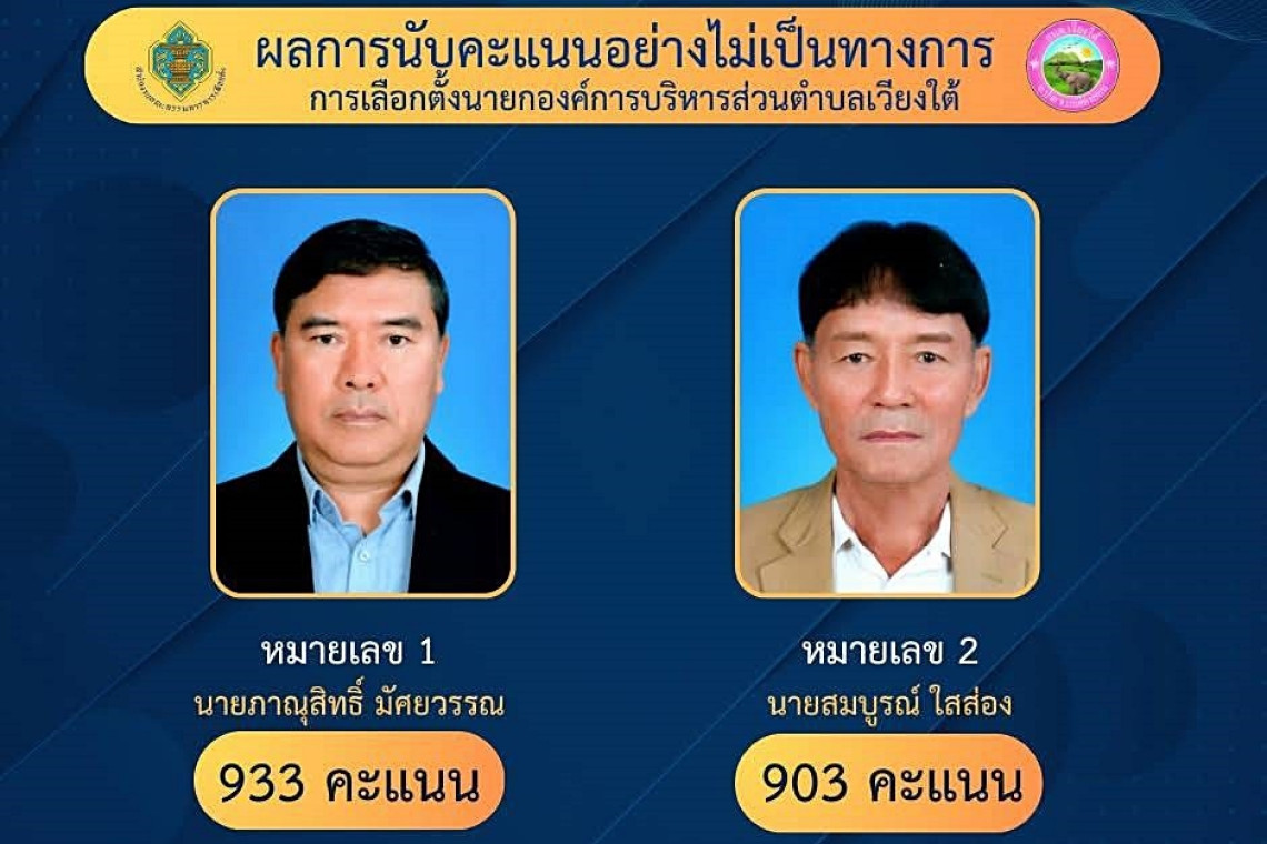 ผลการนับคะแนนอย่างไม่เป็นทางการ การเลือกตั้งนายกองค์การบริหารส่วนตำบลเวียงใต้ ‘ภาณุสิทธิ์’ เฉือน ‘สมบูรณ์’ อย่างหวุดหวิด