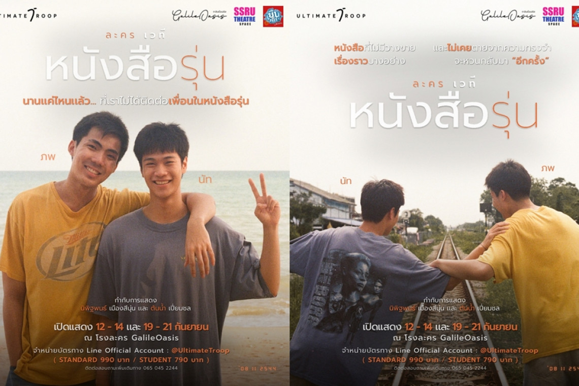 มาย้อนความทรงจำไปกับคู่ ‘ภพ – นัท’ ใน ‘ละครเวที’ เรื่อง ‘หนังสือรุ่น’ จัดแสดง ณ โรงละคร GalileOasis โดยมีรอบการแสดงเวลา 14.00 น. และ เวลา 18.30 น. ในวันที่ 12 – 14 กันยายน และ 19 – 21 กันยายน 2568 พิเศษกับการเพิ่มบัตร Early Bird จำนวน 50 ที่นั่ง พร้อมลดราคา 100 บาท เฉพาะรอบวันที่ 12-14 กันยายน สามารถซื้อบัตรได้ผ่านทาง Line : @UltimateTroop และสามาถติดตามรายละเอียดเพิ่มเติมได้ผ่านทาง Facbook : UltimateTroop, IG : ultimatetroopofficial, TikTok : UltimateTroop, X : UltimateTroop และ YouTube : UltimateTroop Official