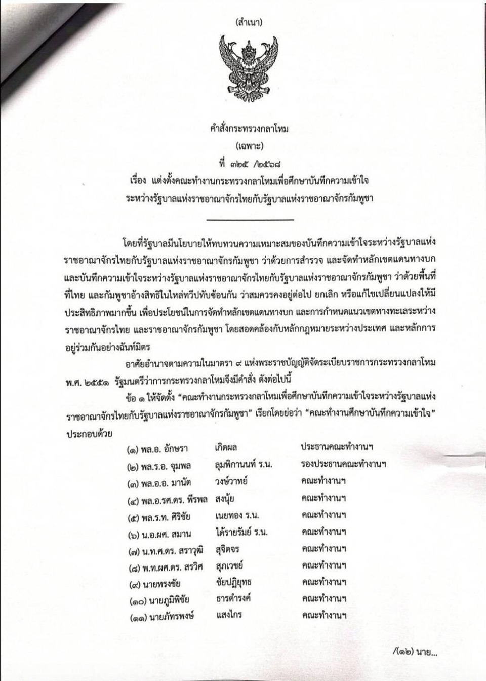 วันที่ 21 ตุลาคม 2568 พล.อ.ณัฐพล นาคพาณิชย์ รมว.กลาโหม ลงนามคำสั่งกระทรวงกลาโหม เรื่อง แต่งตั้งคณะทํางานกระทรวงกลาโหมเพื่อศึกษาบันทึกความเข้าใจระหว่างรัฐบาลแห่งราชอาณาจักรไทยกับรัฐบาลแห่งราชอาณาจักรกัมพูชา