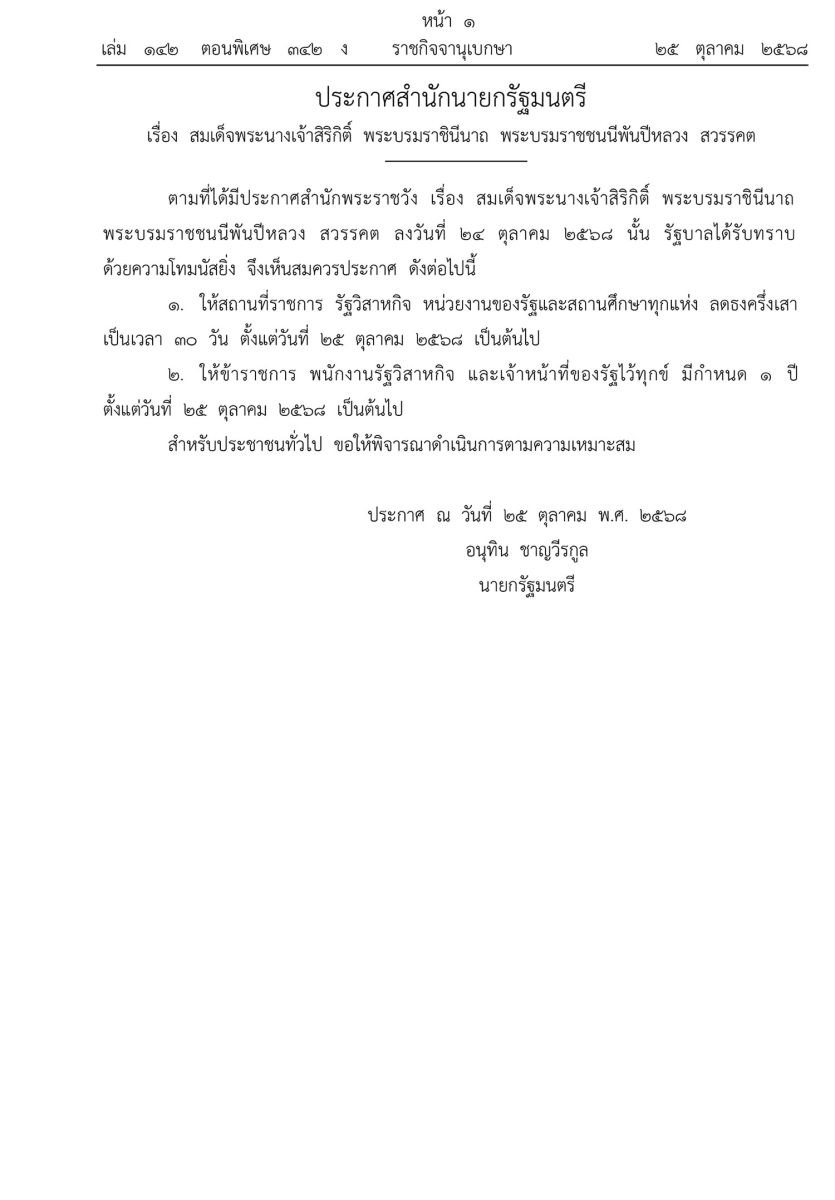 ตามที่ได้มีประกาศสำนักพระราชวัง เรื่อง สมเด็จพระนางเจ้าสิริกิติ์ พระบรมราชินีนาถ พระบรมราชชนนีพันปีหลวง สวรรคต ลงวันที่ 24 ตุลาคม 2568 นั้น รัฐบาลได้รับทราบด้วยความโทมนัสยิ่ง จึงเห็นสมควรประกาศ ดังต่อไปนี้