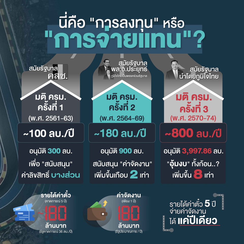 รัฐบาลอายุแค่ 4 เดือน เพื่อยุบสภา แต่ “อนุทินฯ” ทิ้งไว้เพียง มรดกหนี้แผ่นดินเกือบ 4,000 ล้านบาทที่คนไทยต้องจ่ายลากยาวไปถึงปี 2574 เพื่อจัด MotoGP ที่ สนามช้าง อินเตอร์เนชั่นแนล เซอร์กิต ที่เป็นของ บริษัท บุรีรัมย์ยูไนเต็ดอินเตอร์เนชั่นแนลเซอร์กิต จำกัด ตั้งอยู่ที่ 30/2 หมู่ที่ 4 ต.อิสาณ อ.เมืองบุรีรัมย์ จ.บุรีรัมย์ เป็นบ้านเลขที่เดียวกันกับ นายอนุทิน ชาญวีรกูล นายกรัฐมนตรี และยังปรากฏชื่อ “นายเนวิน ชิดชอบ” “นางสาวชิดชนก ชิดชอบ” “นายตนัยศิริ ชาญวิทยารมณ์” และ “นายกนกศักดิ์ ปิ่นแสง” เป็นกรรมการบริษัทฯ อย่างนี้เรียกได้ว่า “มติ ครม. อนุมัติ MotoGP เพื่ออนุทิน-เนวิน” ใช่หรือไม่? ในภาวะที่เศรษฐกิจของประเทศยังเปราะบาง การทุ่มงบประมาณมหาศาลขนาดนี้ลงไปในอีเวนต์เดียว คำถามถึง "ความคุ้มค่า" ที่สำคัญที่สุด เมื่อไล่เรียงลำดับการอนุมัติงบประมาณในแต่ละยุคสมัย