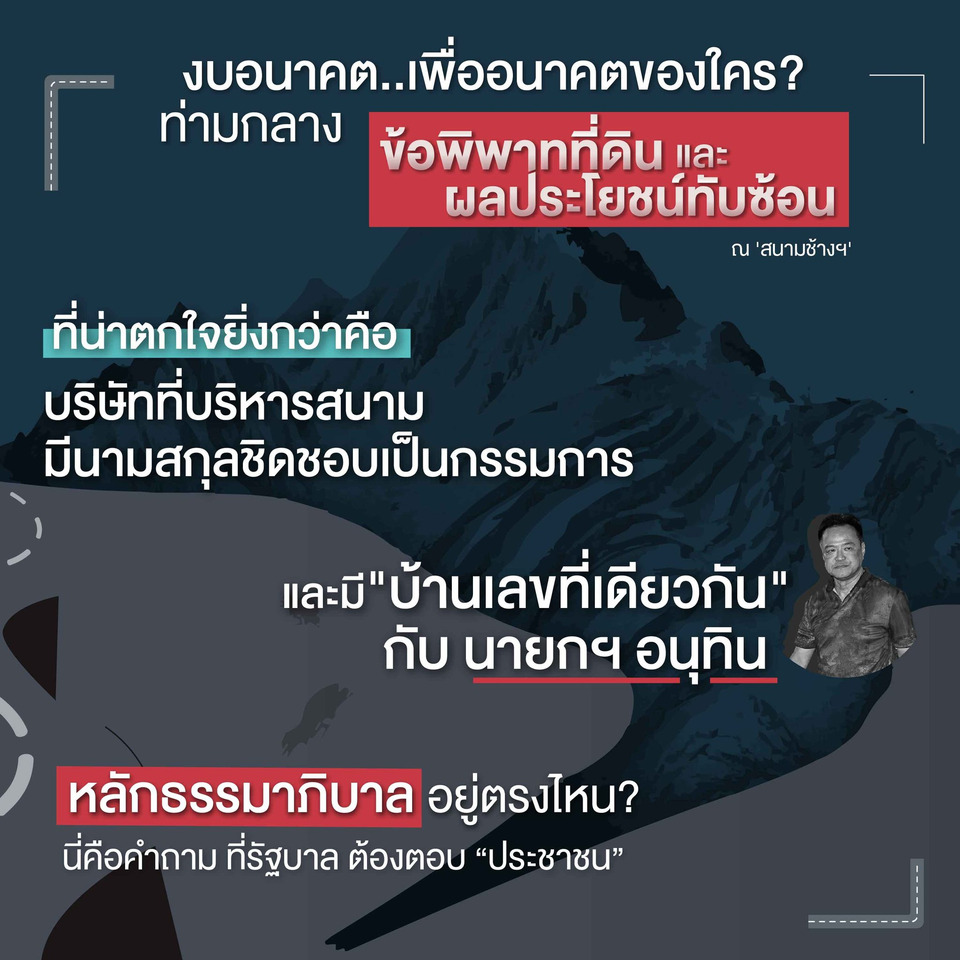การกระทำนี้คือการ "ดึงงบในอนาคตมาใช้" เพื่อสนับสนุนธุรกิจที่เชื่อมโยงกับผู้มีอำนาจในปัจจุบันภายใต้ชื่อ "ส่งเสริมการท่องเที่ยว" แต่ผลประโยชน์อาจไหลกลับเข้ากระเป๋าเอกชนกลุ่มเดิมอย่างชัดเจน แม้กระทั่งที่ดินโดยรอบสนามบางส่วนยังเป็นของ การรถไฟแห่งประเทศไทย ประมาณ 5 พันไร่ แต่กลับถูกพัฒนาเป็น โรงแรม ปั๊มน้ำมัน สนามฟุตบอล และศูนย์ธุรกิจโดยบริษัทในเครือตระกูลเดียวกัน งบประมาณเงินภาษีประชาชน… กลายเป็นรายได้ของ “กลุ่มอำนาจทางการเมือง”