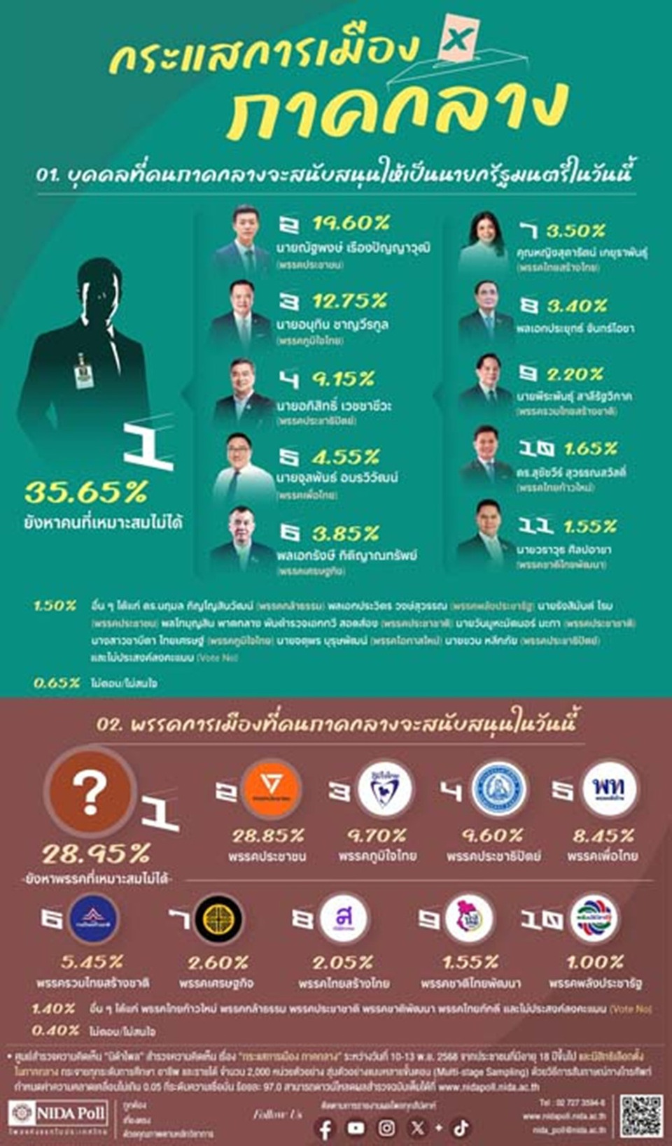 เมื่อวันที่ 16 พ.ย.68 ศูนย์สำรวจความคิดเห็น สถาบันบัณฑิตพัฒนบริหารศาสตร์ (นิด้าโพล) เปิดเผยผลสำรวจ เรื่อง “กระแสการเมือง ภาคกลาง” สำรวจระหว่างวันที่ 10 - 13 พ.ย. 2568 จากประชาชนที่มีอายุ 18 ปีขึ้นไป และมีสิทธิเลือกตั้งในภาคกลาง (จำนวน 17 จังหวัด ประกอบด้วย ชัยนาท พระนครศรีอยุธยา ลพบุรี สระบุรี สิงห์บุรี อ่างทอง นนทบุรี ปทุมธานี นครปฐม สมุทรปราการ กาญจนบุรี ราชบุรี สุพรรณบุรี ประจวบคีรีขันธ์ เพชรบุรี สมุทรสงคราม และสมุทรสาคร) กระจายทุกระดับการศึกษา อาชีพ และรายได้ รวมจำนวนทั้งสิ้น 2,000 หน่วยตัวอย่าง