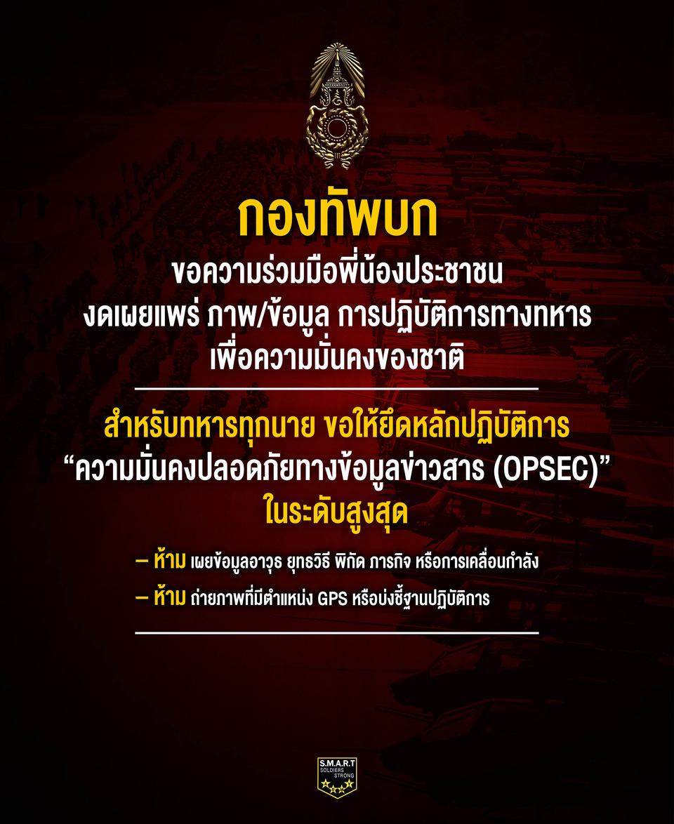 วันที่ 16 พ.ย.2568 กองทัพบกขอความร่วมมือพี่น้องประชาชน รวมถึงกำลังพลทุกนาย งดเผยแพร่ภาพหรือข้อมูลเกี่ยวกับการปฏิบัติการทางทหาร เพื่อป้องกันไม่ให้ข้อมูลสำคัญถูกนำไปวิเคราะห์ต่อยอด จนส่งผลกระทบต่อความปลอดภัยของทหารในพื้นที่และความมั่นคงของประเทศ