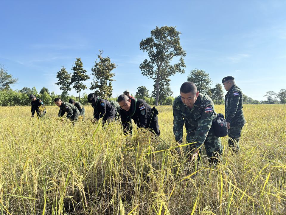 ขณะเดียวกัน หลายแปลงอยู่ในพื้นที่ติดชายแดน ทำให้ชาวบ้านบางส่วนไม่มั่นใจว่าจะเข้ามาเกี่ยวข้าวได้อย่างปลอดภัย ทหารจึงเข้ามาช่วยคุ้มกันพื้นที่ให้ชาวบ้านทำงานได้อย่างสบายใจ ลงแรงเกี่ยวข้าวในแปลงที่เร่งด่วน อำนวยความสะดวกให้รถเกี่ยวข้าวเข้า–ออกได้โดยไม่ติดขัด