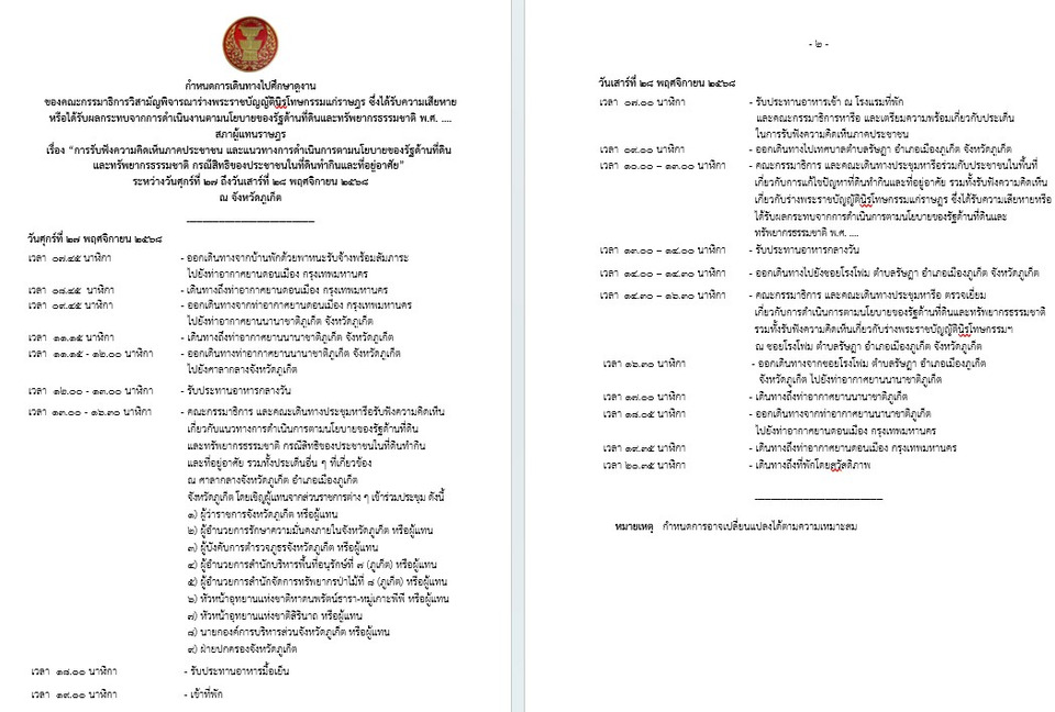 ผู้สื่อข่าวรายงานเพิ่มเติมว่า คณะกรรมาธิการฯ จะมีการรับฟังความเห็นภาคประชาชนและแนวทางการดำเนินการตามนโยบายของรัฐ ด้านที่ดินและทรัพยากรธรรมชาติ ระหว่างวันที่ 28-29 พฤศจิกายน พ.ศ. 2568 ณ จังหวัดภูเก็ต