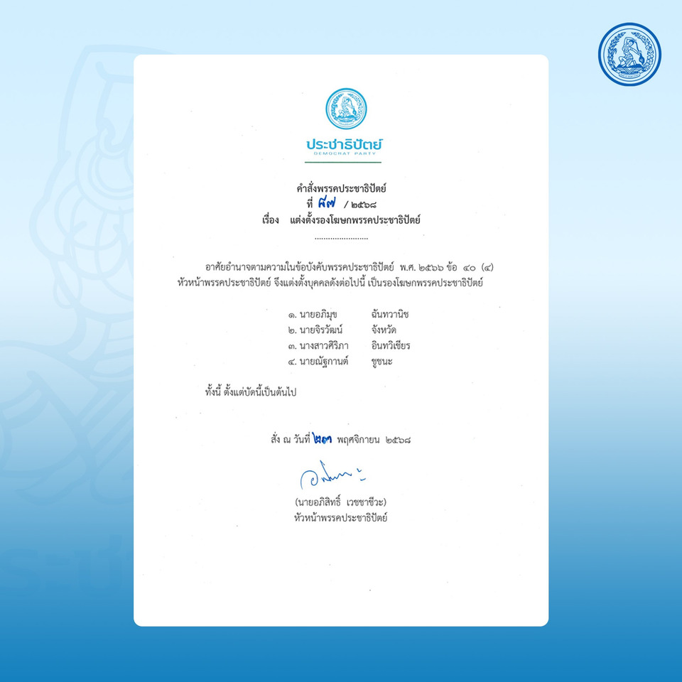 วันที่ 23 พฤศจิกายน 2568 นายอภิสิทธิ์ เวชชาชีวะ หัวหน้าพรรคประชาธิปัตย์ ได้แต่งตั้งรองโฆษกพรรคประชาธิปัตย์ เพื่อรับฟัง และสะท้อนเสียงของประชาชนให้ดังยิ่งขึ้น จำนวน 4 คน โดยประกอบด้วย 1.นายอภิมุข ฉันทวานิช 2.นายจิรวัฒน์ จังหวัด 3.น.ส.ศิริภา อินทวิเชียร และ 4.นายณัฐกานต์ ชูชนะ
