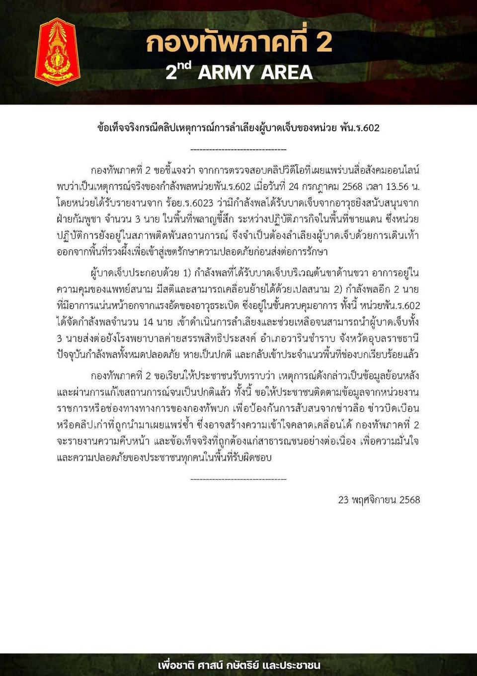 วันที่ 23 พฤศจิกายน 2568 จากกรณีที่มีการเผยแพร่คลิปวีดีโอกรณีกำลังพลได้รับบาดเจ็บ ถูกสะเก็ดระเบิดที่บริเวณช่วงขา นั้น แหล่งข่าวระดับสูงจากกองทัพภาคที่ 2 เผยว่า เหตุการณ์ดังกล่าวเกิดขึ้นเมื่อ 24 ก.ค.68 เวลาประมาณ 13.56 น.ซึ่งทางหน่วยผู้บังคับบัญชา ได้รับรายงานจากกองร้อยทหารราบที่ 6023 (ร้อย.ร.6023 ) ร.6 พัน.3 ว่า กำลังพลที่ปฏิบัติงานบริเวณพลาญขี้สัก พื้นที่ช่องบก ที่ถูกฝ่ายกัมพูชาโจมตีด้วยอาวุธยิงสนับสนุน ทำให้กำลังพลได้รับบาดเจ็บจากสะเก็ดกระสุนปืน จำนวน 3 นาย หน่วยจึงจัดชุดรับผู้ป่วยเจ็บเดินเท้าเข้าในพื้นที่ เพื่อรับกำลังพลทั้ง 3 นาย