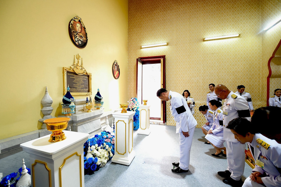 นายกรัฐมนตรี จุดรูปเทียนบูชาพระรัตนตรัย และจุดธูปเทียนเครื่องทองน้อยถวายราชสักการะพระบรมฉายาลักษณ์พระบาทสมเด็จพระมงกุฎเกล้าเจ้าอยู่หัว และจุดรูปเทียนเครื่องทองน้อยถวายสักการะพระรูปสมเด็จพระเจ้าภคินีเธอ เจ้าฟ้าเพชรรัตนราชสุดา สิริโสภาพัณณวดี