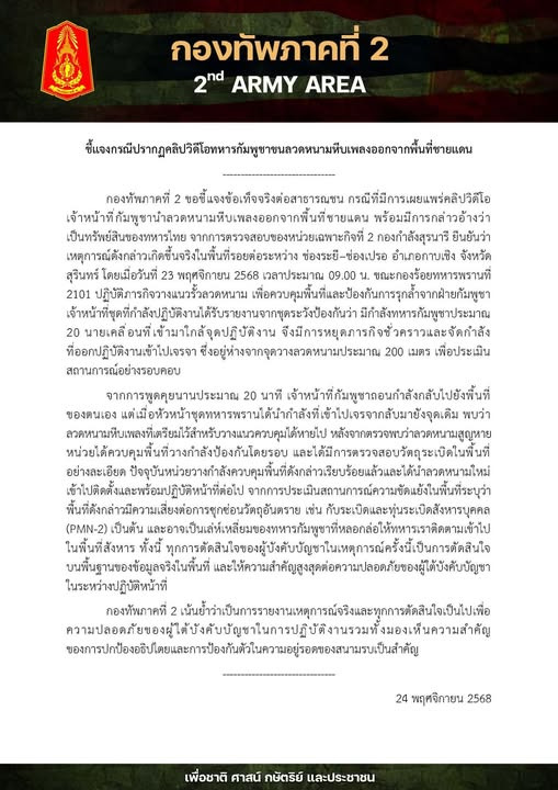 วันที่ 24 พ.ย.68 กองทัพภาคที่ 2 ขอชี้แจงข้อเท็จจริงต่อสาธารณชน กรณีที่มีการเผยแพร่คลิปวิดีโอเจ้าหน้าที่กัมพูชานำลวดหนามหีบเพลงออกจากพื้นที่ชายแดน พร้อมมีการกล่าวอ้างว่าเป็นทรัพย์สินของทหารไทย จากการตรวจสอบของหน่วยเฉพาะกิจที่ 2 กองกำลังสุรนารี ยืนยันว่าเหตุการณ์ดังกล่าวเกิดขึ้นจริงในพื้นที่รอยต่อระหว่าง ช่องระยี–ช่องเปรอ อำเภอกาบเชิง จังหวัดสุรินทร์