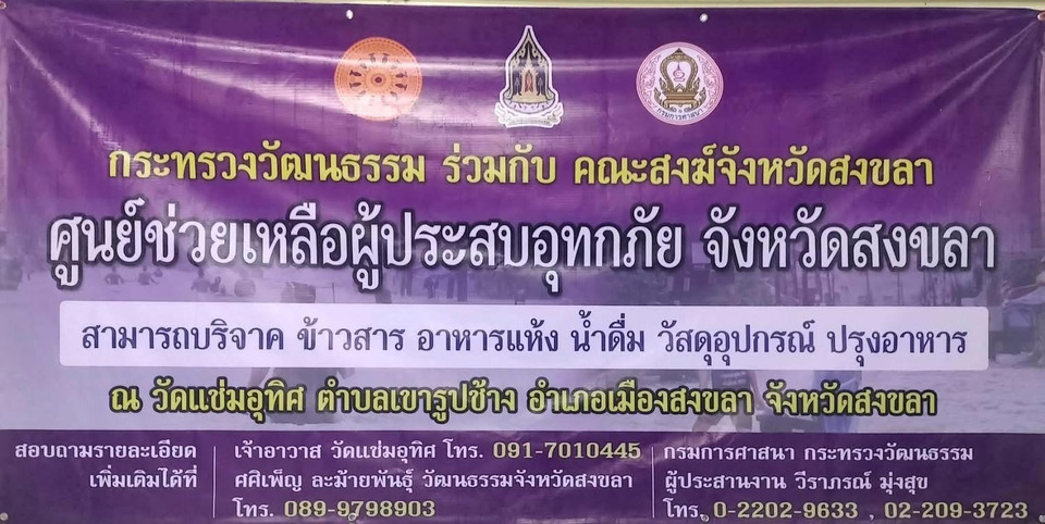 รัฐมนตรีว่าการกระทรวงวัฒนธรรม กล่าวต่อไปว่า นอกจากนี้กระทรวงวัฒนธรรม โดยกรมการศาสนา กรมศิลปากร ร่วมกับสำนักงานวัฒนธรรมจังหวัดสงขลา คณะสงฆ์จังหวัดสงขลา และองค์กรศาสนาทั้ง 5 ศาสนา ได้ร่วมกันเปิด ศูนย์ช่วยเหลือผู้ประสบภัย พร้อม 9 ศูนย์พักพิงชั่วคราว สามารถรองรับได้ 1,240 คน ได้แก่ 1. วัดแช่มอุทิศ (100 คน) 2. วัดโพธิ์ปฐมาวาส (100 คน) 3. วัดไทรงาม (100 คน) 4. วัดภูเขาหลง (200 คน) 5. วัดศรีษะคีรี (100 คน) 6. หอสมุดแห่งชาติ กาญจนาภิเษก สงขลา (300 คน) 7. หอจดหมายเหตุแห่งชาติเฉลิมพระเกียรติฯ สงขลา (200 คน) 8. วัดหัวป้อมใน (100 คน) 9. วัดโคกพยอมสุการาม (40 คน)