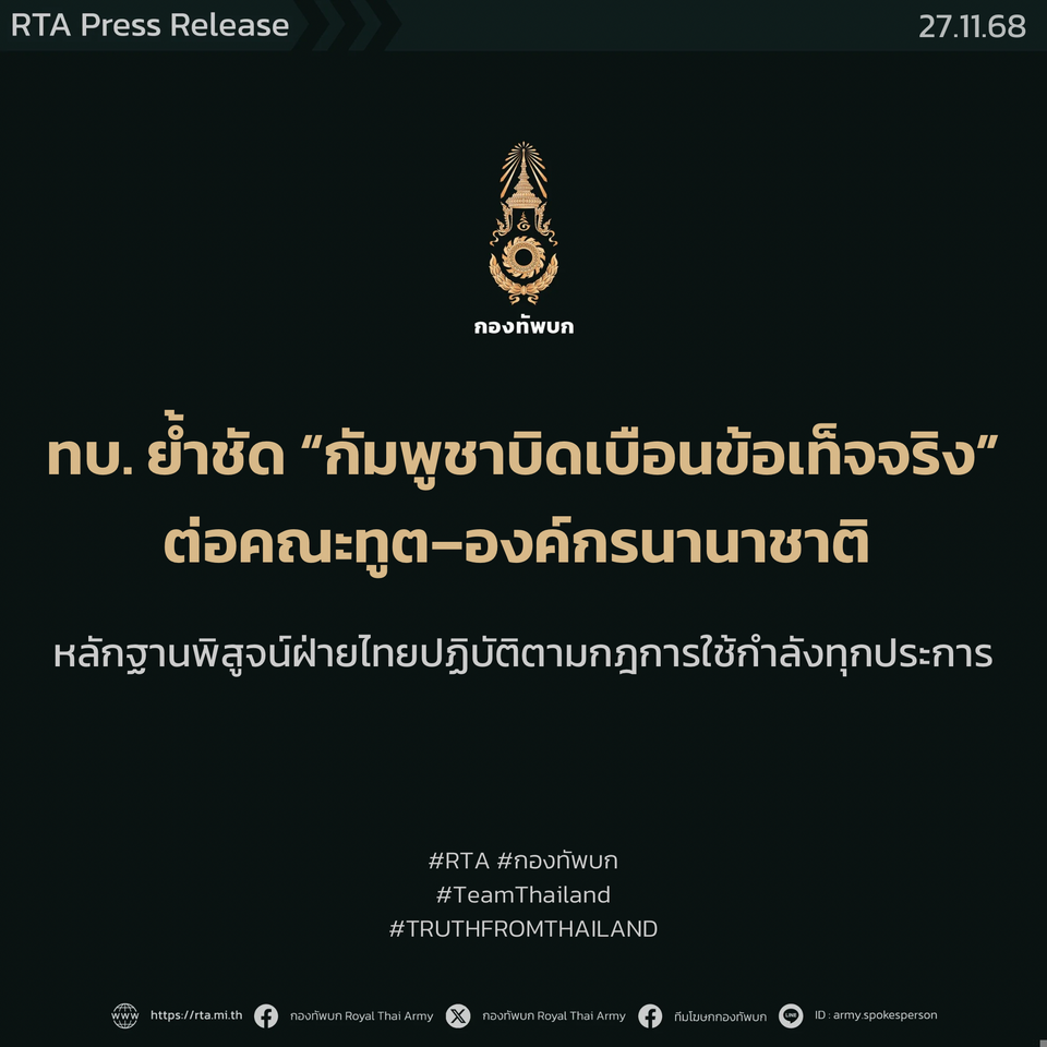 วันที่ 27 พ.ย.68 พลตรี วินธัย สุวารี โฆษกกองทัพบก ระบุว่า “กรณีนี้เป็นอีกหนึ่งความพยายามของฝ่ายกัมพูชาในการสร้างภาพและบิดเบือนหลักฐานต่อสังคมโลก เชื่อว่าคณะทูตจากต่างประเทศย่อมพิจารณาข้อมูลอย่างรอบด้าน ไม่ได้ฟังความฝ่ายใดฝ่ายหนึ่งจากเพียงคำกล่าวอ้าง ทั้งนี้ กระทรวงการต่างประเทศของไทยได้ชี้แจงข้อมูลและหลักฐานต่อคณะทูต รวมทั้งคณะ AOT แล้ว โดยเฉพาะคณะ AOT ที่ฝ่ายไทยได้นำลงพื้นที่จริง เพื่อให้เห็นข้อเท็จจริงด้วยตนเอง ซึ่งทำให้สามารถแยกแยะเจตนาที่ไม่บริสุทธิ์ของฝ่ายกัมพูชาออกจากข้อเท็จจริงที่เกิดขึ้นได้อย่างชัดเจน”
