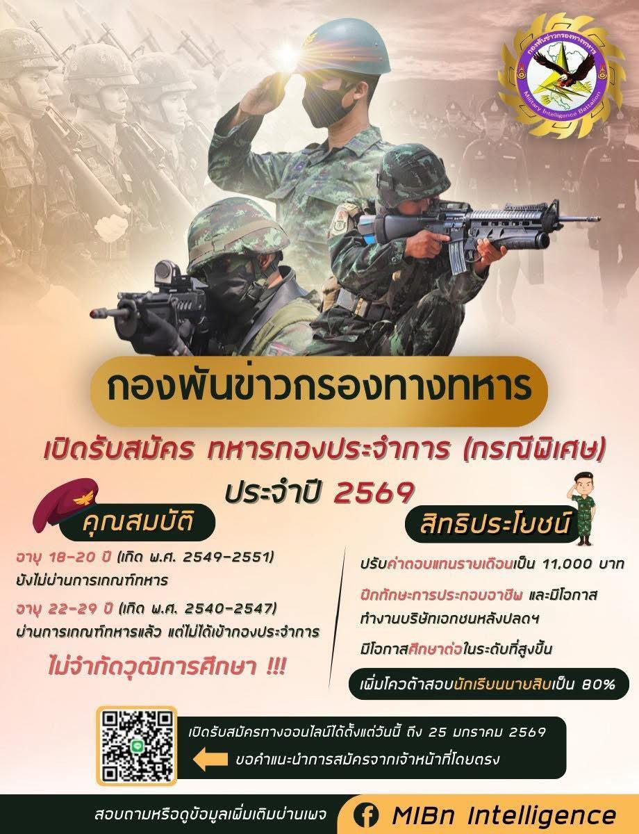 วันที่ 3 ธ.ค.68 เพจ ข่าวทหาร โพสต์ข้อความระบุว่า กองพันข่าวกรองทางทหาร มีความยินดีตอนรับ น้องๆ ที่มีความสนใจเข้ารับราชการทหารกองประจำการ เข้ามาเป็นส่วนหนึ่งของครอบครัวกองทัพบก สังกัด กองพันข่าวกรองทางทหาร