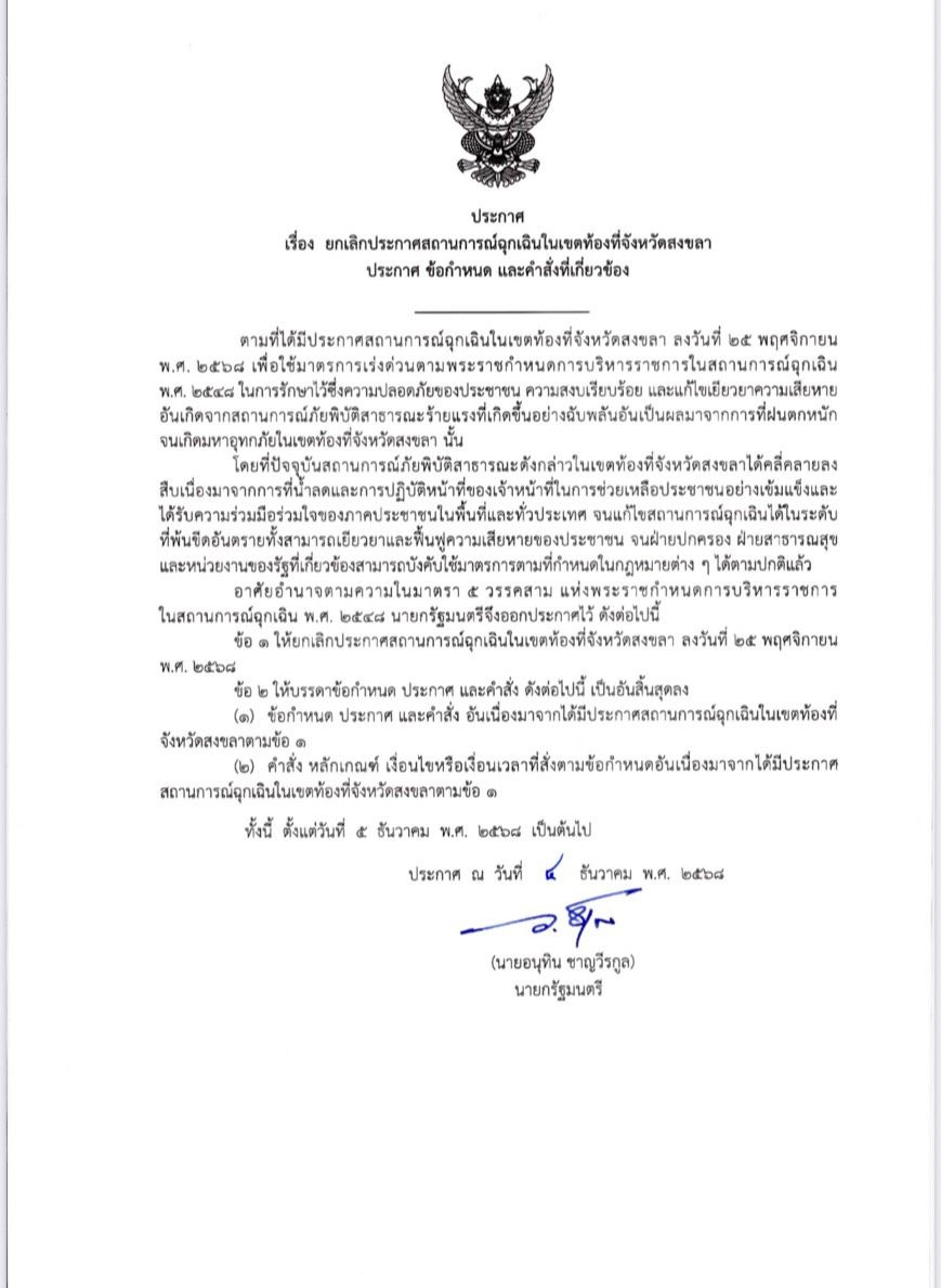 นายกฯ ลงนามยกเลิกสถานการณ์ฉุกเฉินสงขลา หลังน้ำลด–สถานการณ์คลี่คลาย มีผลตั้งแต่ 5 ธ.ค. เป็นต้นไป พร้อมเดินหน้าฟื้นฟูและเยียวยาประชาชนในพื้นที่อย่างต่อเนื่อง