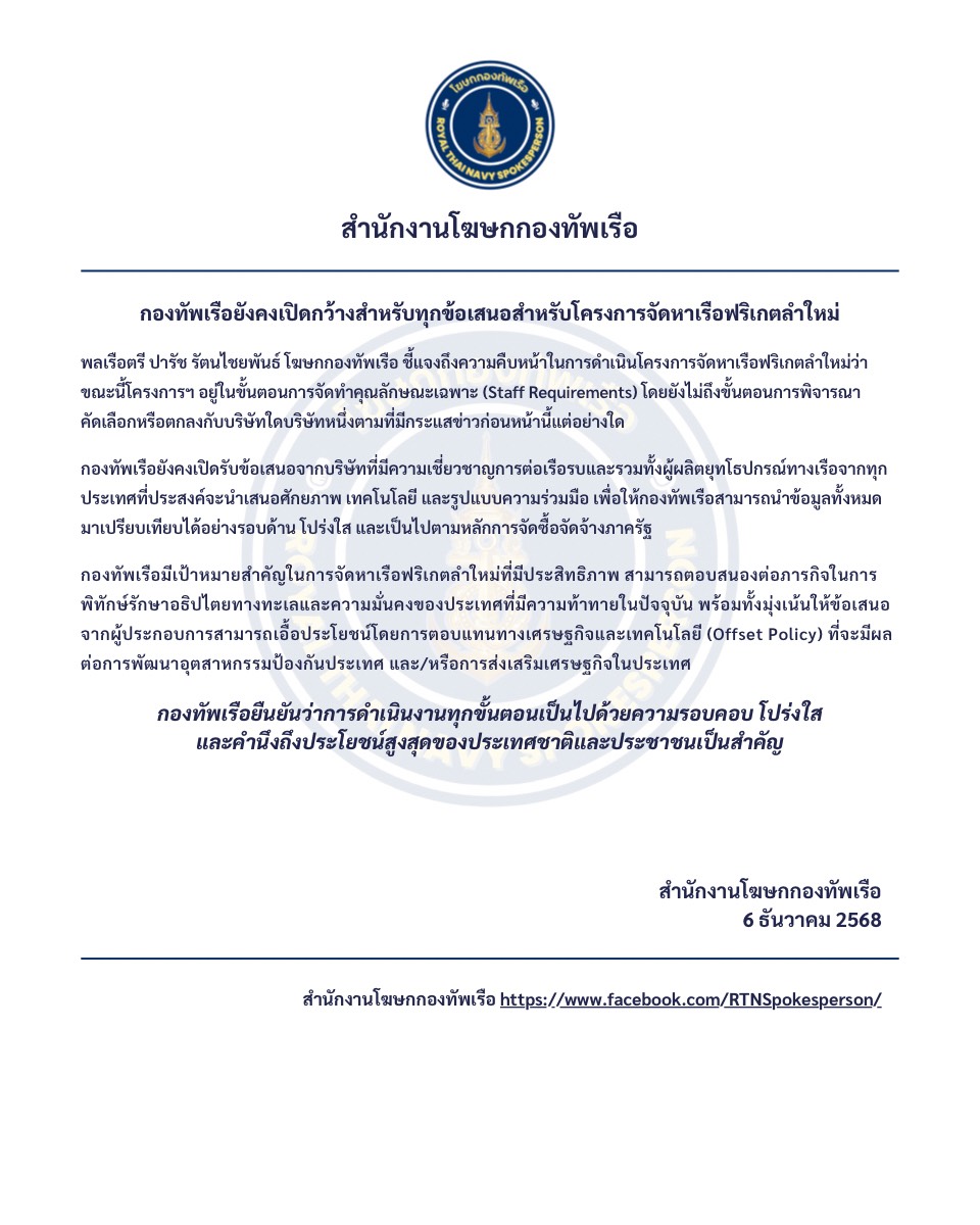 กองทัพเรือยืนยันว่าการดำเนินงานทุกขั้นตอนเป็นไปด้วยความรอบคอบ โปร่งใส และคำนึงถึงประโยชน์สูงสุดของประเทศชาติและประชาชนเป็นสำคัญ