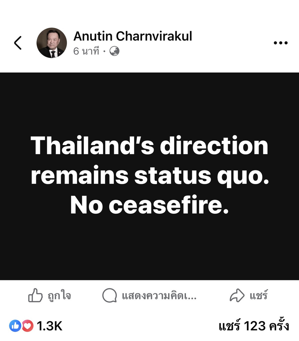 ผู้สื่อข่าวรายงานว่า เมื่อเวลา 19.20 น. วันที่ 9 ธ.ค. 68 นายอนุทิน ชาญวีรกูล นายกรัฐมนตรีและรัฐมนตรีว่าการกระทรวงมหาดไทย โพสต์ข้อความผ่านเฟซบุ๊กส่วนตัว ระบุถึงสถานการณ์รบชายแดนไทย-กัมพูชา ว่า “Thailand’s direction remains status quo. No ceasefire. ( ทิศทางของไทยยังคงเดิม ไม่มีการหยุดยิง) ”