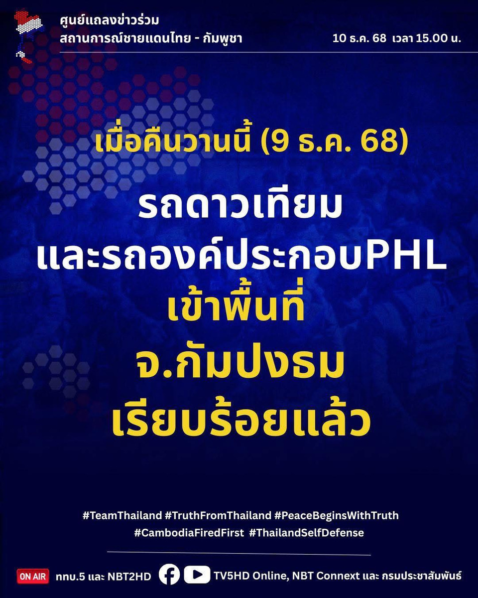 เมื่อคืนวานนี้ (9 ธ.ค. 68) รถดาวเทียมและรถองค์ประกอบ PHL เข้าพื้นที่ จ.กัมปงธม เรียบร้อยแล้ว