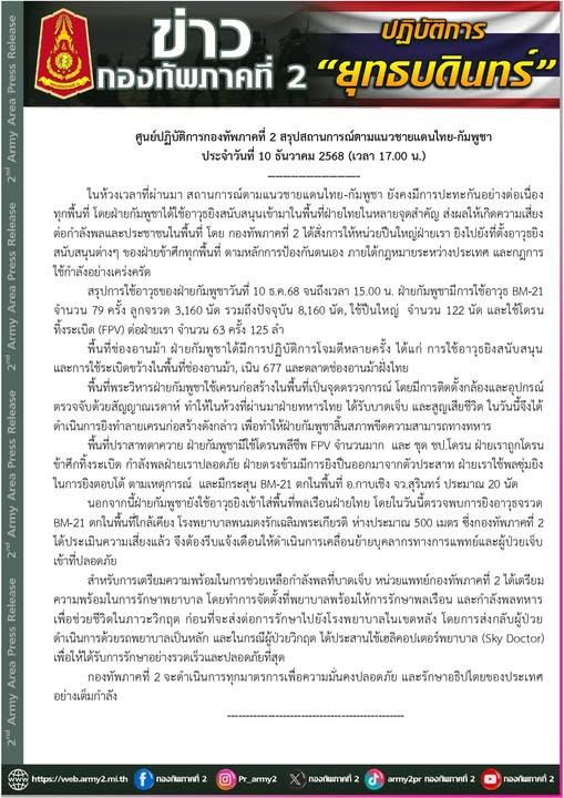 วันที่ 10 ธ.ค.68 ศูนย์ปฏิบัติการกองทัพภาคที่ 2 สรุปสถานการณ์ตามแนวชายแดนไทย-กัมพูชา ประจำวันที่ 10 ธันวาคม 2568 (เวลา 17.00 น.)