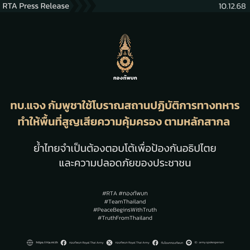 เมื่อวันที่ 10 ธ.ค.68 พลตรี วินธัย สุวารี โฆษกกองทัพบก ได้ชี้แจงว่า ประเทศไทยยึดมั่นใน อนุสัญญากรุงเฮก ค.ศ. 1954 ว่ากรณีความขัดแย้งทางอาวุธ ซึ่งกำหนดให้โบราณสถาน ต้องได้รับการคุ้มครอง และห้ามการโจมตีหรือการกระทำใด ๆ ที่อาจก่อให้เกิดความเสียหาย