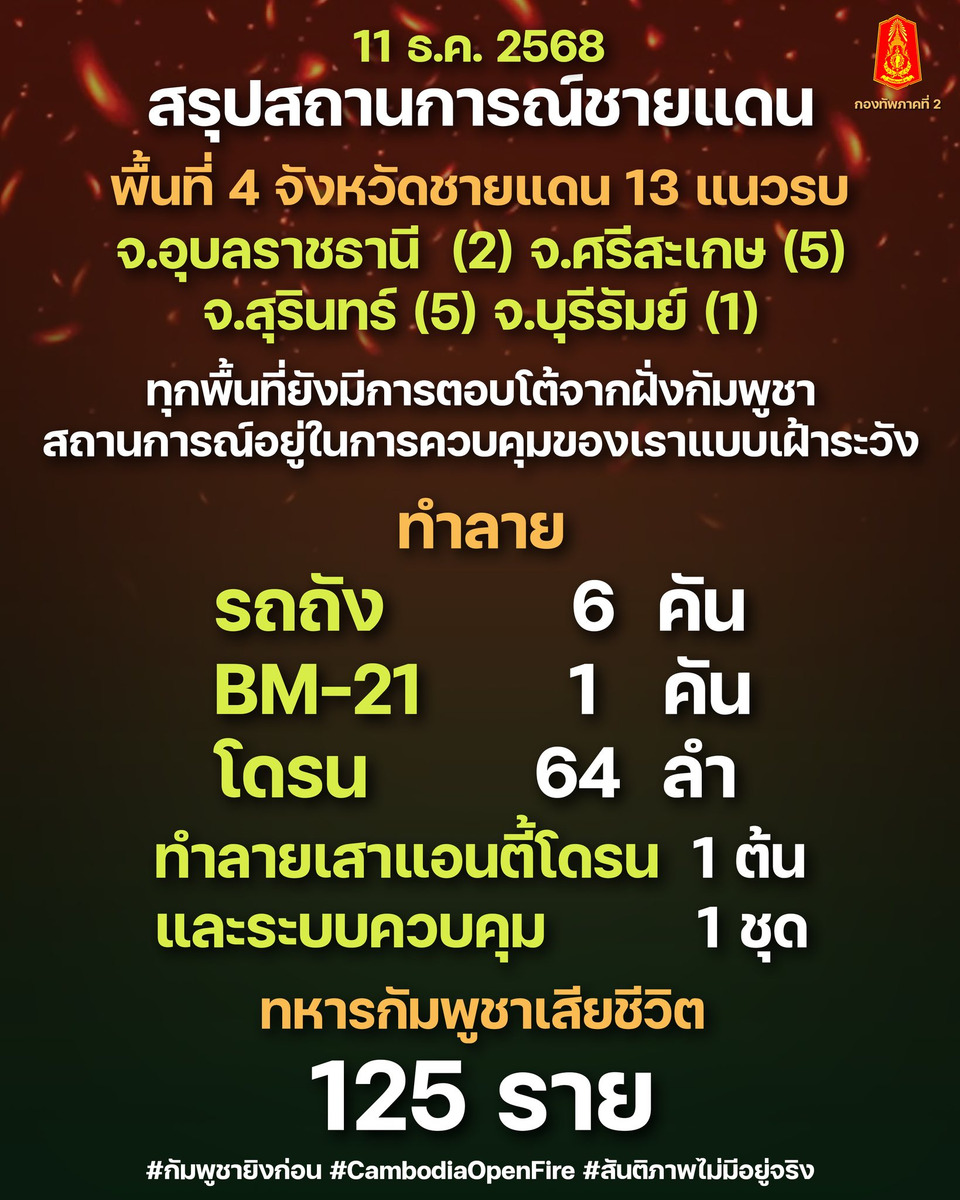 11 ธ.ค. 2568 สรุปสถานการณ์ชายแดน พื้นที่ 4 จังหวัดชายแดน 13 แนวรบ จ.อุบลราชรานี (2) จ.ศรีสะเกษ (5) จ.สุรินทร์ (5) จ.บุรีรัมย์ (1)