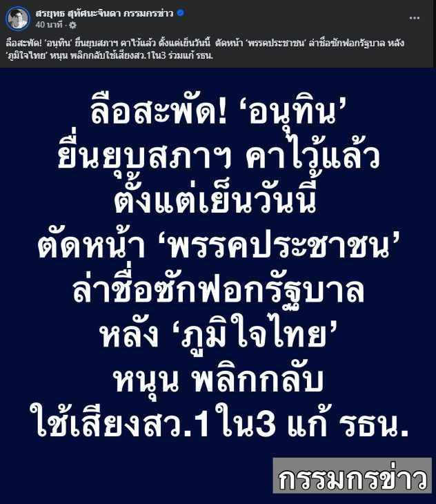 ลือสะพัด! ‘อนุทิน’ ยื่นยุบสภาฯ คาไว้แล้ว ตั้งแต่เย็นวันนี้ ตัดหน้า ‘พรรคประชาชน’ ล่าชื่อซักฟอกรัฐบาล หลัง ‘ภูมิใจไทย’ หนุน พลิกกลับใช้เสียงสว.1ใน3 ร่วมแก้ รธน.