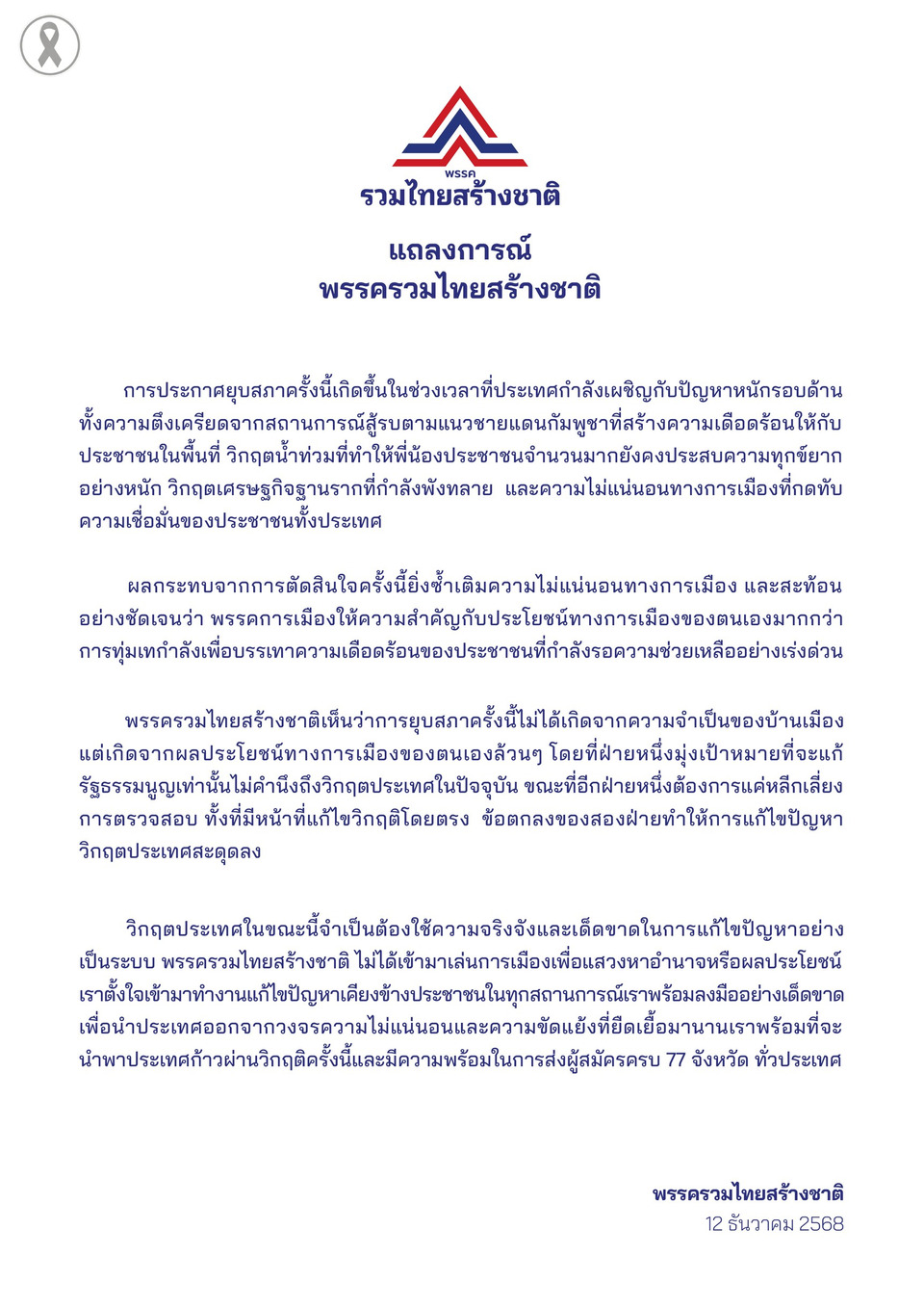 วันที่ 12 ธ.ค.2568 พรรครวมไทยสร้างชาติ ออกแถลงการณ์ ภายหลังจากที่นายอนุทิน ชาญวีรกูล นายกรัฐมนตรีและรมว.มหาดไทย ประกาศยุบสภา โดยระบุว่า