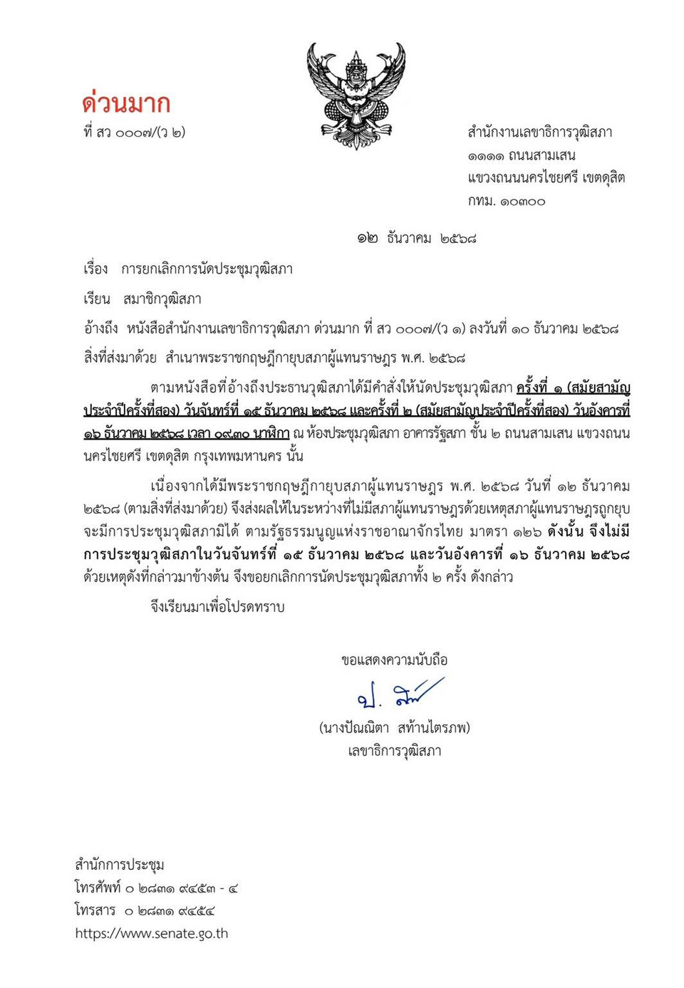 เมื่อเวลา 21.00 น. วันที่ 12 ธ.ค.68 นางปัณณิตา สท้านไตรภพ เลขาธิการวุฒิสภา ได้ออกหนังสือ ด่วนมาก ที่ สว 0007 /(ว 2) ถึงสมาชิก วุฒิสภา เรื่องยกเลิกการประชุมวุฒิสภา พร้อมแนบสําเนาพระราชกฤษฎีกายุบสภาผู้แทนราษฎร พ.ศ.2568 โดยระบุว่า ตามหนังสือที่อ้างถึงประธานวุฒิสภาได้มีคําสั่งให้นัดประชุมวุฒิสภา ครั้งที่ 1 (สมัยสามัญประจําปี ครั้งที่สอง) วันจันทร์ที่ 15 ธันวาคม 2568 และครั้งที่ 2 (สมัยสามัญประจําปี ครั้งที่สอง) วันอังคารที่ 16 ธันวาคม 2568 เวลา 09.30 น. ณ ห้องประชุมวุฒิสภาอาคารรัฐสภา ชั้น 2 ถนนสามเสน แขวงถนน นครไชยศรี เขตดุสิต กรุงเทพมหานคร นั้น