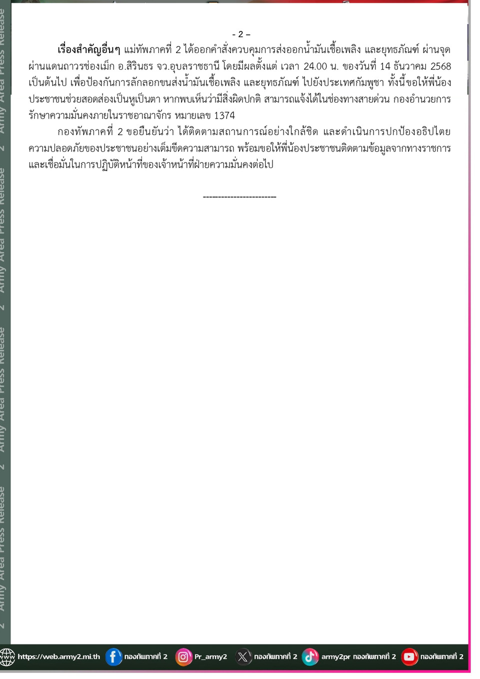 แม่ทัพภาคที่ 2 ได้ออกคำสั่งควบคุมการส่งออกน้ำมันเชื้อเพลิง และยุทธภัณฑ์ ผ่านจุดผ่านแดนถาวรช่องเม็ก อ.สิรินธร จว.อุบลราชธานี โดยมีผลตั้งแต่ เวลา 24.00 น. ของวันที่ 14 ธันวาคม 2568 เป็นต้นไป เพื่อป้องกันการลักลอกขนส่งน้ำมันเชื้อเพลิง และยุทธภัณฑ์ ไปยังประเทศกัมพูชา ทั้งนี้ขอให้พี่น้องประชาชนช่วยสอดส่องเป็นหูเป็นตา หากพบเห็นว่ามีสิ่งผิดปกติ สามารถแจ้งได้ในช่องทางสายด่วน กองอำนวยการรักษาความมั่นคงภายในราชอาณาจักร หมายเลข 1374