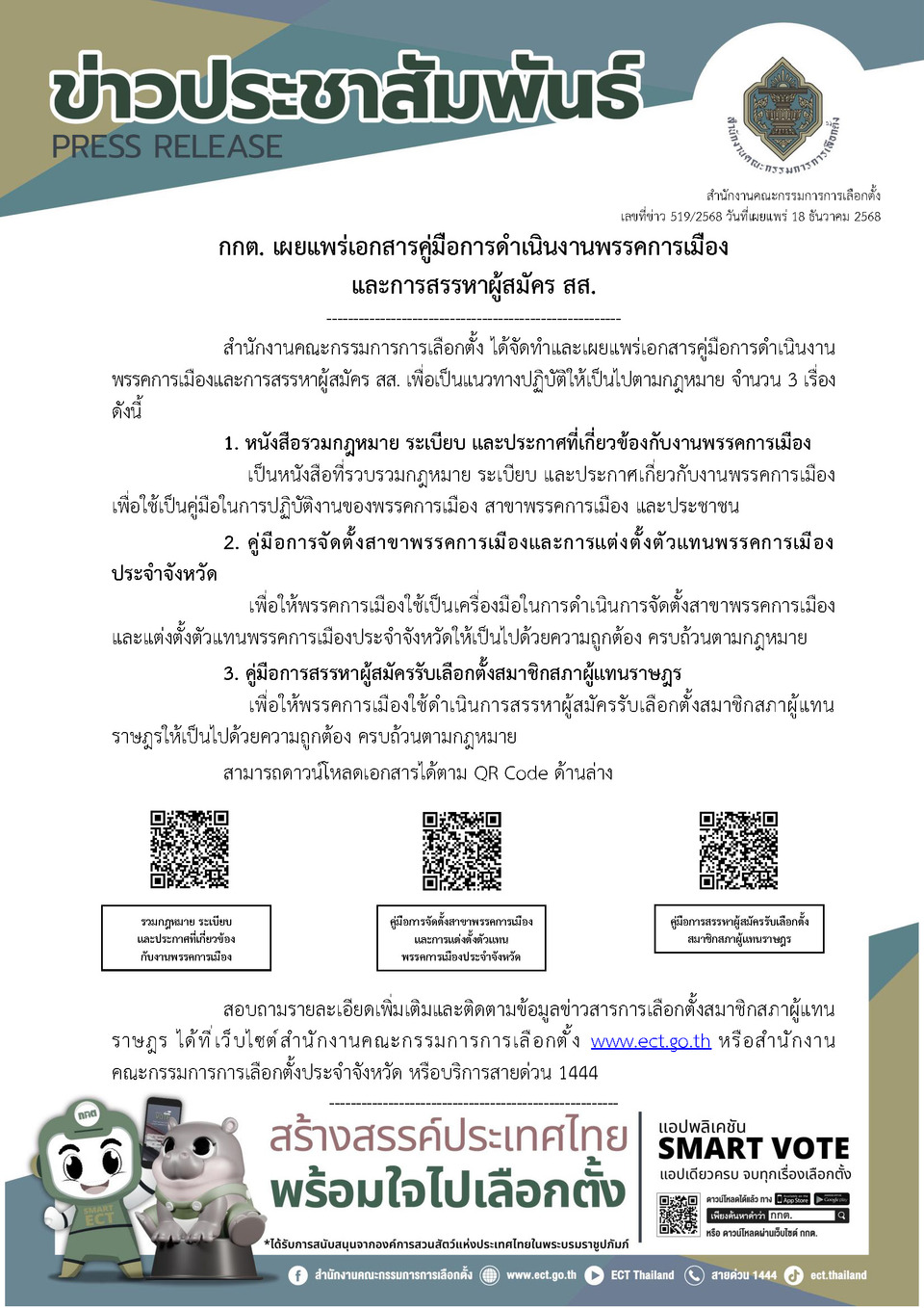วันที่ 19 ธ.ค.68 สำนักงานคณะกรรมการการเลือกตั้ง (กกต.) ออกเอกสารประชาสัมพันธ์ให้ผู้สมัคร พรรคการเมืองและผู้เกี่ยวข้องรับทราบเรื่องหลักเกณฑ์และวิธีการจัดทำสถานที่ปิดป้ายประกาศเกี่ยวกับการเลือกตั้งและสถานที่ติดแผ่นป้ายเกี่ยวกับการหาเสียงเกี่ยวกับการเลือกตั้งสมาชิกสภาผู้แทนราษฎร พ.ศ. 2566 เพื่อให้การเลือกตั้งเป็นไปด้วยความสุจริต เที่ยงธรรมและชอบด้วยกฎหมาย