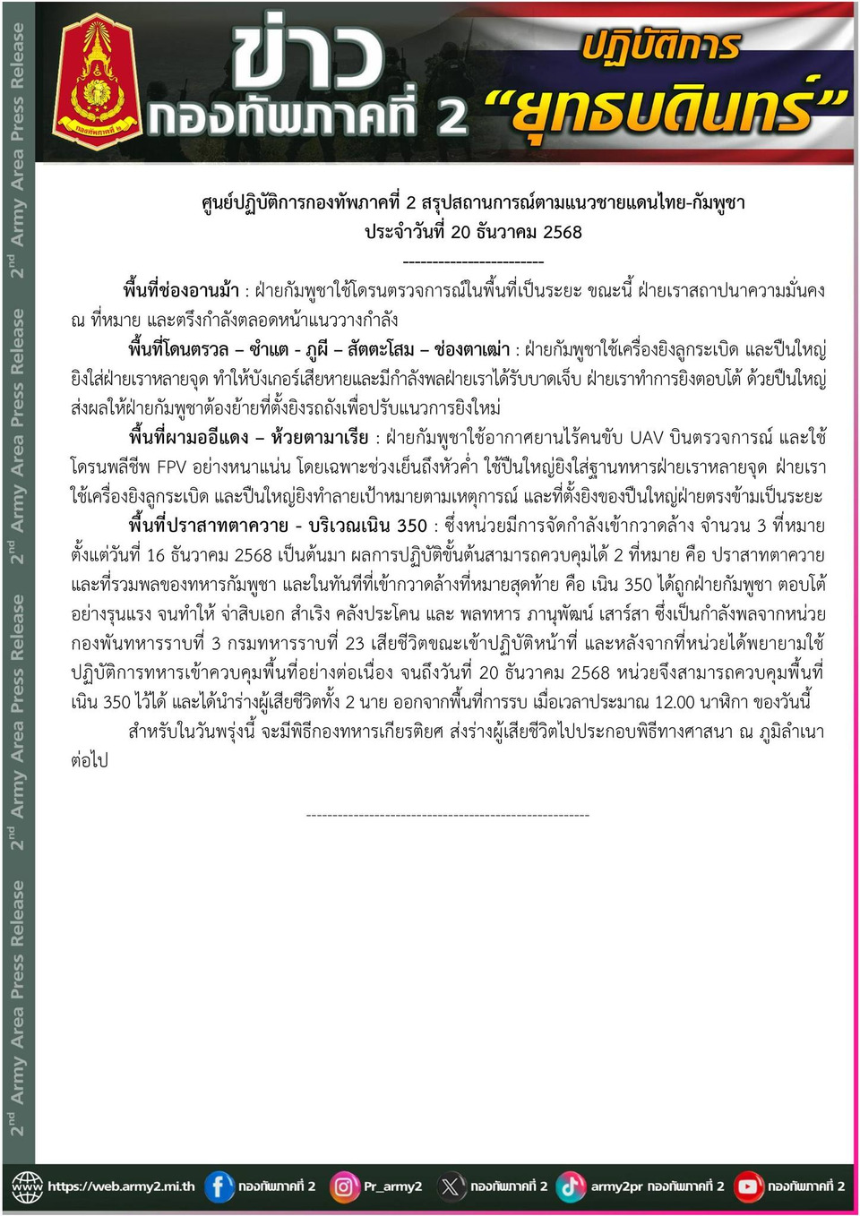 วันที่ 20 ธ.ค.2568 ศูนย์ปฏิบัติการกองทัพภาคที่ 2 สรุปสถานการณ์ตามแนวชายแดนไทย-กัมพูชา ประจำวันที่ 20 ธันวาคม 2568 ดังนี้