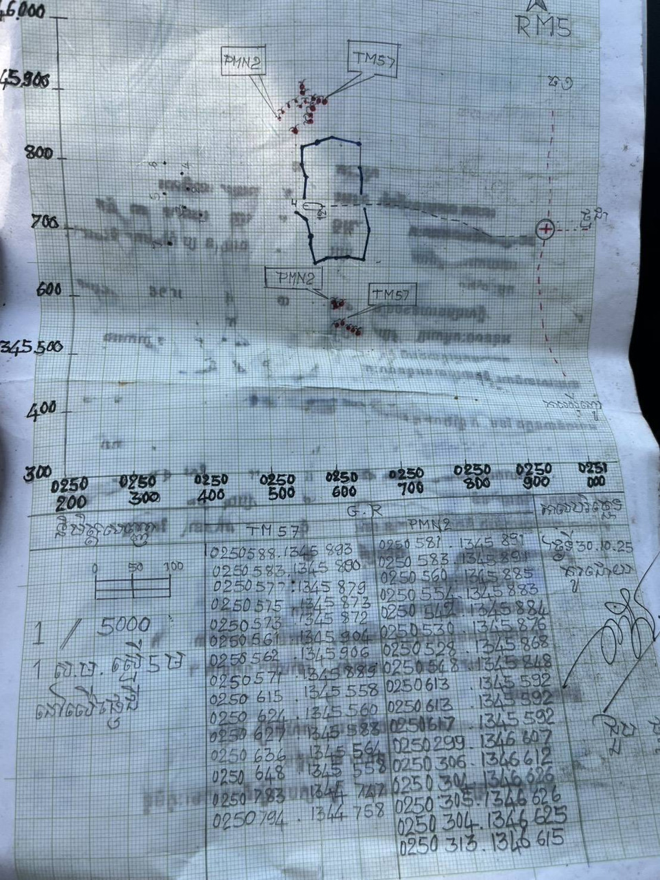 การตรวจพบ แผนผังแสดงตำแหน่งการฝังทุ่นระเบิดสังหารบุคคลและทุ่นระเบิดดัดแปลง ในพื้นที่บ้านหนองรี ซึ่งสะท้อนถึงการเตรียมการล่วงหน้าเพื่อประสงค์ต่อชีวิตทหารไทย