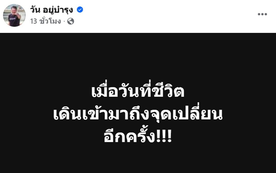 วันที่ 22 ธ.ค.68 นายวัน อยู่บำรุง กรรมการบริหารพรรคพลังประชารัฐ (พปชร.) ได้โพสต์ข้อความผ่านเฟซบุ๊กส่วนตัวว่า "เมื่อวันที่ชีวิตเดินเข้ามาถึงจุดเปลี่ยนอีกครั้ง!!!"