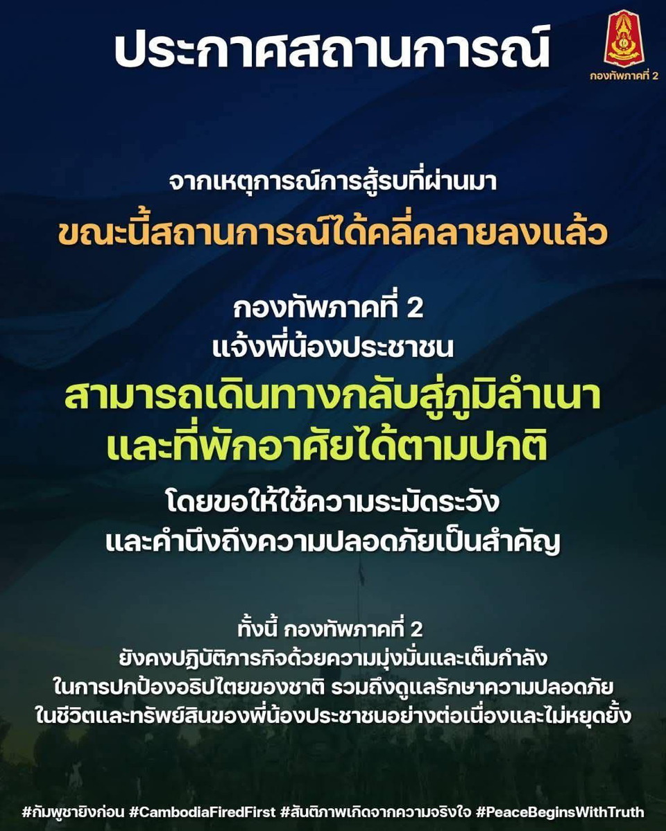 จากเหตุการณ์การสู้รบที่ผ่านมาขณะนี้สถานการณ์ได้คลี่คลายลงแล้ว