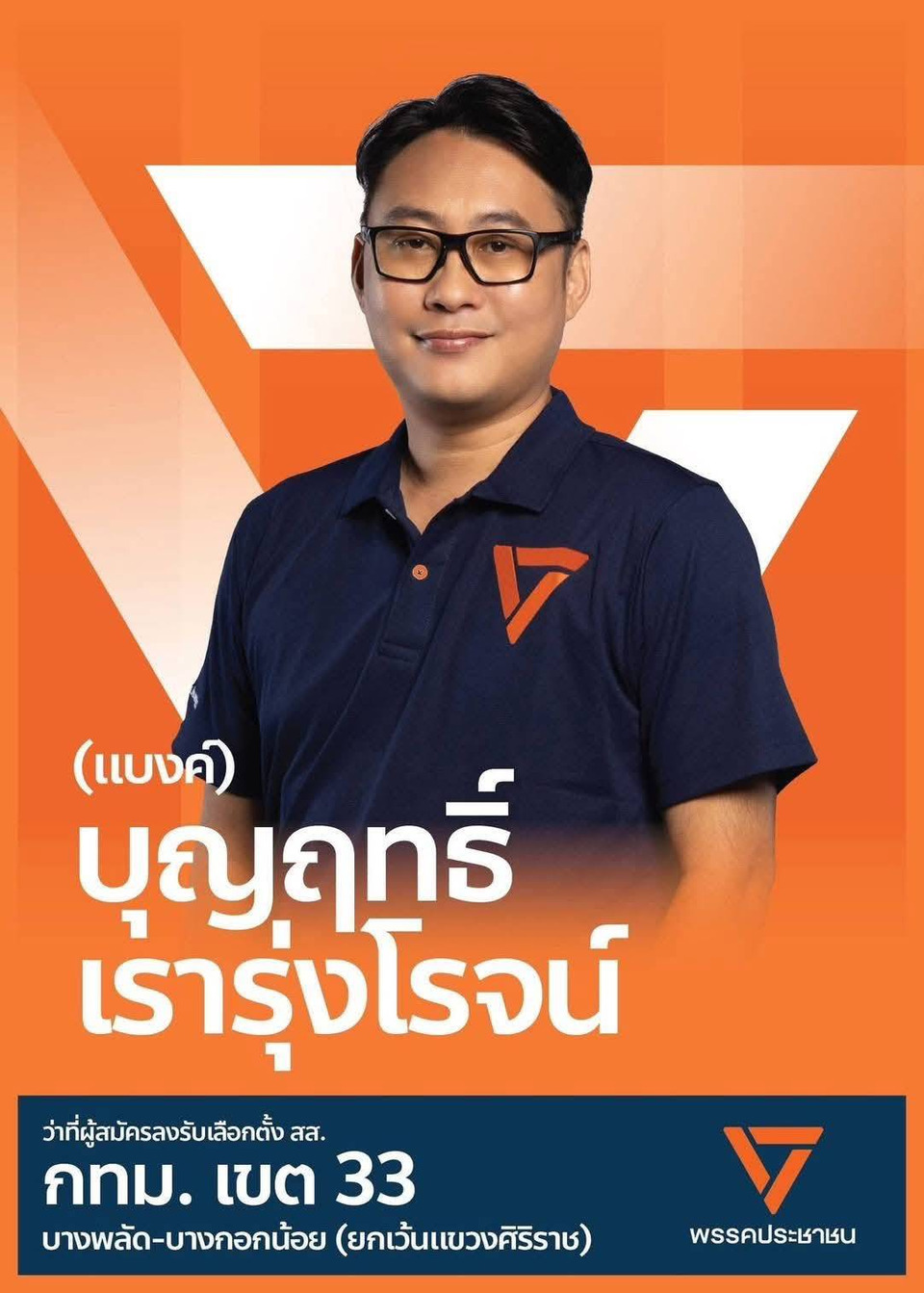 “บุญฤทธิ์ เรารุ่งโรจน์” ชื่อเล่นชื่อ “แบงค์” ผู้สมัคร สส. กรุงเทพมหานคร เขต 33 บางพลัด-บางกอกน้อย พรรคประชาชน สำเร็จการศึกษาระดับมัธยมศึกษาจากโรงเรียนเตรียมอุดมศึกษา