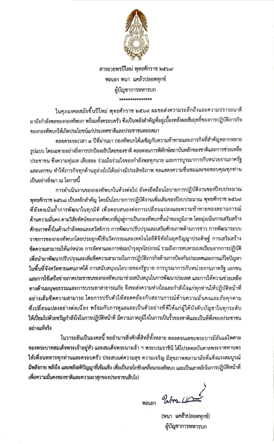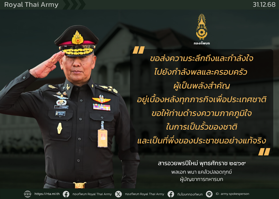 ในศุภมงคลสมัยขึ้นปีใหม่ พุทธศักราช 2569 ผมขอส่งความระลึกถึงและความปรารถนาดีมายังกำลังพลของกองทัพบก พร้อมทั้งครอบครัว ซึ่งเป็นพลังสำคัญที่อยู่เบื้องหลังผลสัมฤทธิ์ของการปฏิบัติภารกิจของกองทัพบกให้เกิดประโยชน์แก่ประเทศชาติและประชาชนตลอดมา