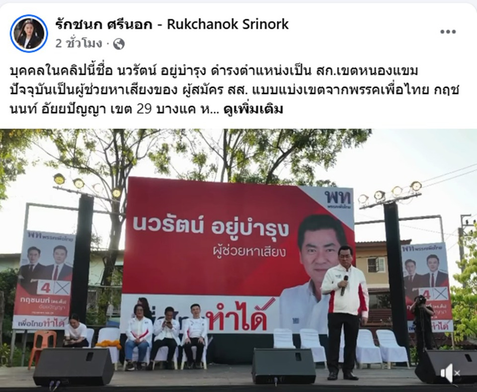 “บุคคลในคลิปนี้ชื่อ นวรัตน์ อยู่บำรุง ดำรงตำแหน่งเป็น สก.เขตหนองแขม ปัจจุบันเป็นผู้ช่วยหาเสียงของ ผู้สมัคร สส. แบบแบ่งเขตจากพรรคเพื่อไทย กฤชนนท์ อัยยปัญญา เขต 29 บางแค หนองแขม