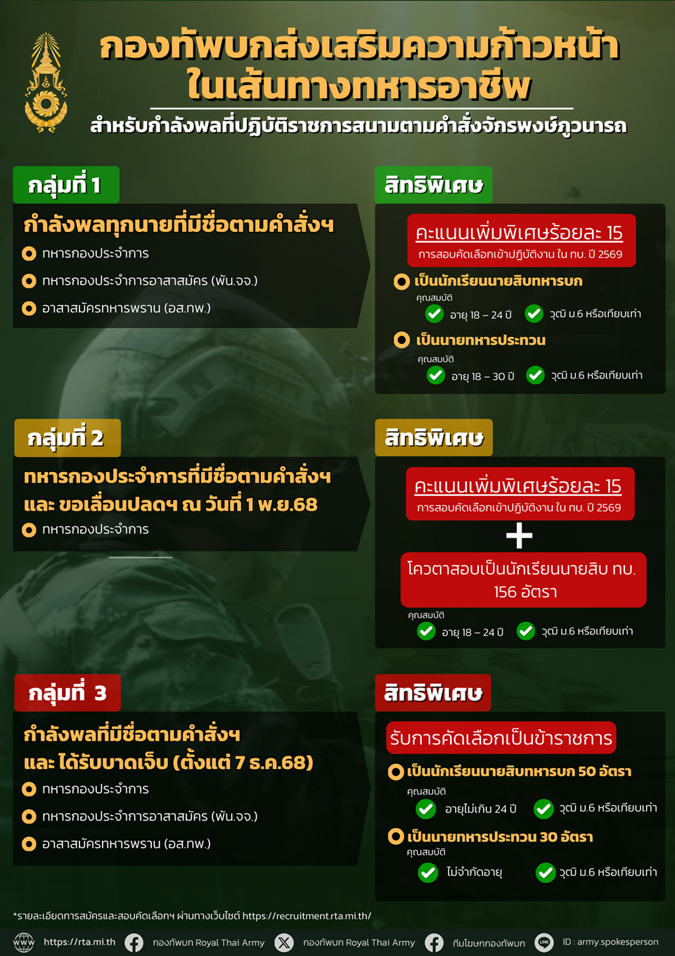 - กำลังพลประเภททหารกองประจำการที่ปฏิบัติราชการสนามและขอเลื่อนปลดจากกองประจำการ ณ วันที่ 1 พ.ย.68 นอกจากได้รับคะแนนเพิ่มพิเศษในการสอบคัดเลือกบุคคลเข้าปฏิบัติงานในกองทัพบก ประจำปี 2569 จำนวนร้อยละ 15 แล้ว จะได้รับโควตาจำนวนที่นั่งในการสอบนักเรียนนายสิบทหารบก จำนวน 156 อัตราด้วย