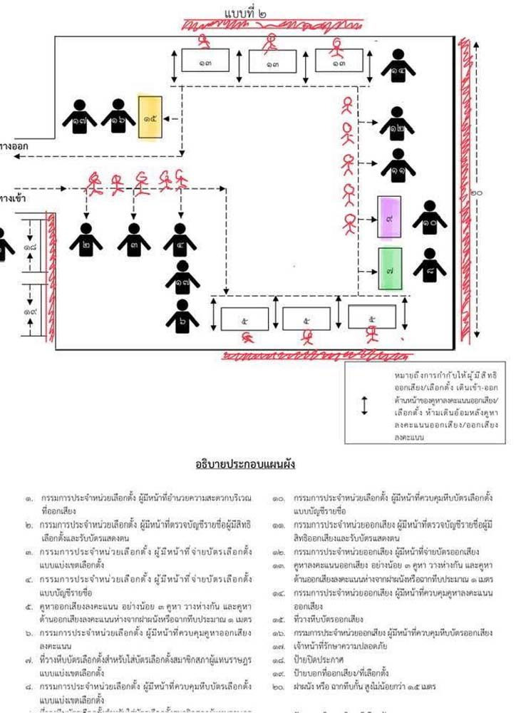 2. ประชาชนต้องเข้าคิว 2 รอบ รอบแรกเพื่อรับบัตรเลือก สส. สองใบ (จุดที่ 2-3-4) เข้าคูหาครั้งที่ 1 (จุดที่ 5) ออกมาหย่อนบัตร(จุดที่ 7,9) เข้าคิวใหม่ รับบัตรประชามติ (จุดที่ 11,12) เข้าคูหาครั้งที่ 2 (จุดที่ 13) ออกมาหย่อนบัตรรอบที่ 2 (จุดที่ 15)