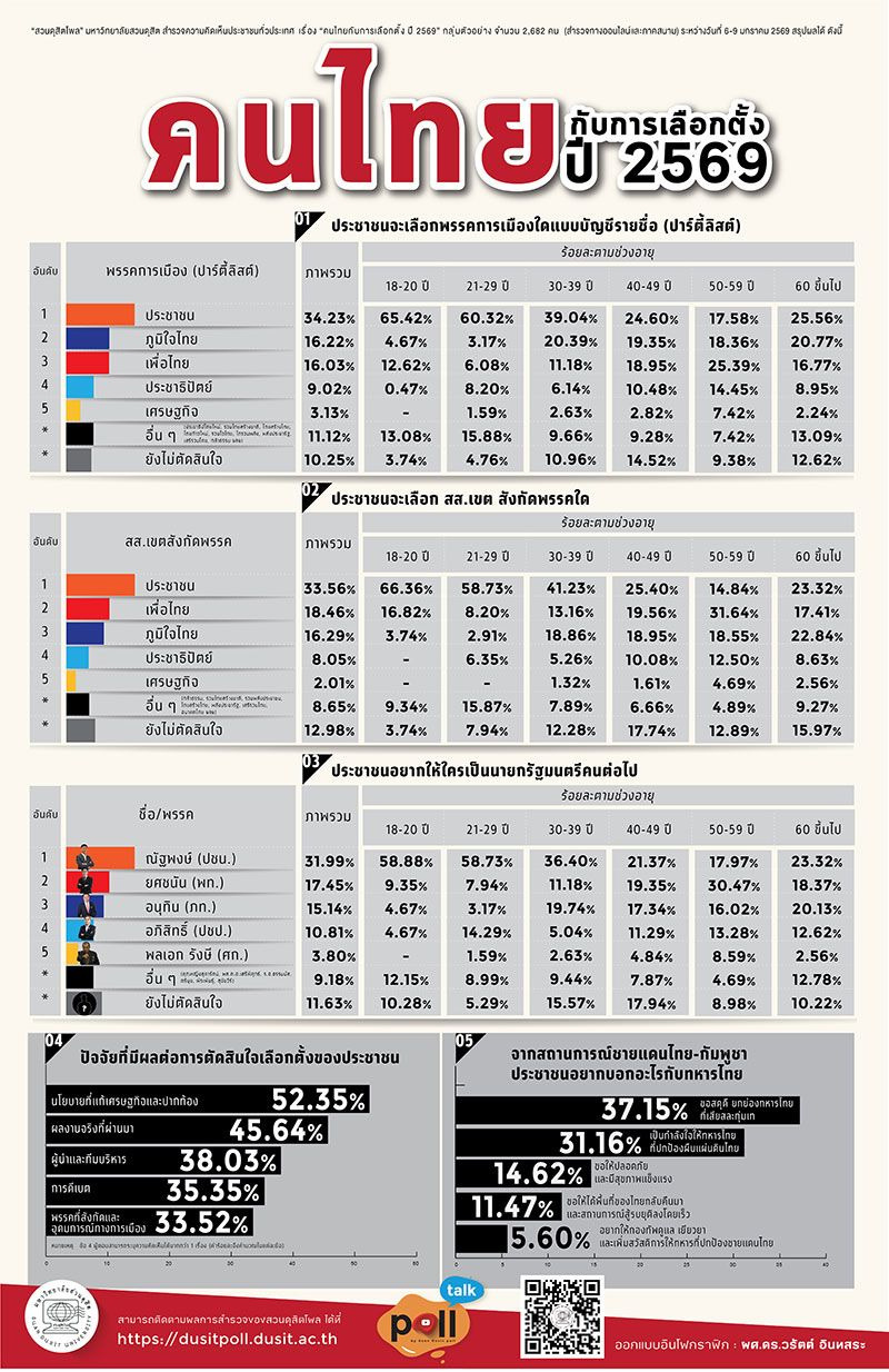 เมื่อวันที่ 11 มกราคม 2569 “สวนดุสิตโพล” มหาวิทยาลัยสวนดุสิต สำรวจความคิดเห็นประชาชนทั่วประเทศ เรื่อง “คนไทยกับการเลือกตั้งปี 2569” กลุ่มตัวอย่างจำนวน 2,682 คน (สำรวจทางออนไลน์และภาคสนาม) ระหว่างวันที่ 6-9 มกราคม 2569 พบว่าถ้ามีการเลือกตั้ง กลุ่มตัวอย่างจะเลือกพรรคประชาชน ร้อยละ 34.23 รองลงมา คือ ภูมิใจไทย ร้อยละ 16.22 และเพื่อไทยร้อยละ 16.03 และเลือก สส.เขตสังกัดพรรคประชาชน ร้อยละ 33.56 รองลงมาคือ เพื่อไทย ร้อยละ 18.46 และภูมิใจไทย ร้อยละ 16.29 ทั้งนี้บุคคลที่อยากให้เป็นนายกรัฐมนตรีคนต่อไป คือ ณัฐพงษ์ เรืองปัญญาวุฒิ (ปชน.) ร้อยละ 31.99 ยศชนัน วงศ์สวัสดิ์ (พท.) ร้อยละ 17.45 อนุทิน ชาญวีรกูล (ภท.) ร้อยละ 15.14 โดยปัจจัยที่มีผลต่อการตัดสินใจเลือกตั้ง คือนโยบายที่แก้เศรษฐกิจและปากท้อง ร้อยละ 52.35 รองลงมา คือ ผลงานจริงที่ผ่านมา ร้อยละ 45.64