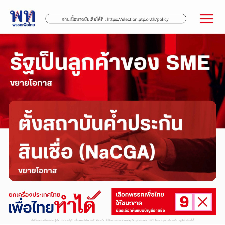 ตั้งสถาบันค้ำประกันสินเชื่อ (NaCGA) : จัดตั้ง National Credit Guarantee Agency เพื่อใช้ "ประวัติการชำระเงิน" และ "ข้อมูลธุรกิจ" แทนหลักทรัพย์ที่เป็นที่ดิน ช่วยให้ SME รายเล็กเข้าถึงแหล่งทุนได้ตามศักยภาพจริง