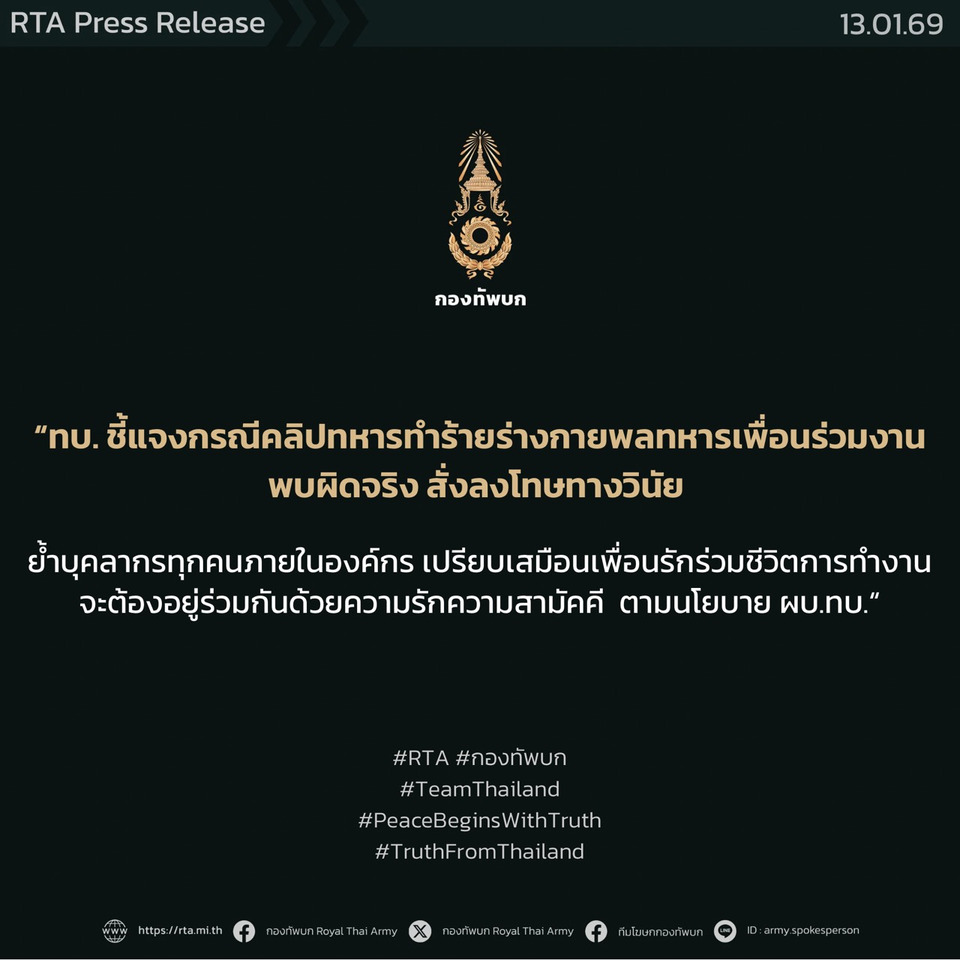 วันที่ 13 ม.ค.69 กองทัพบก แจงกรณีที่ปรากฏคลิปวิดีโอที่มีลักษณะทหารทะเลาะวิวาทและทำร้ายร่างกายในสื่อสาธารณะ กองทัพบกได้ตรวจสอบพบว่าเหตุการณ์ดังกล่าวเกิดขึ้นเมื่อวันที่ 7 ต.ค. 68 ณ กองร้อยบริการ ศูนย์การกำลังสำรอง จ.ประจวบคีรีขันธ์