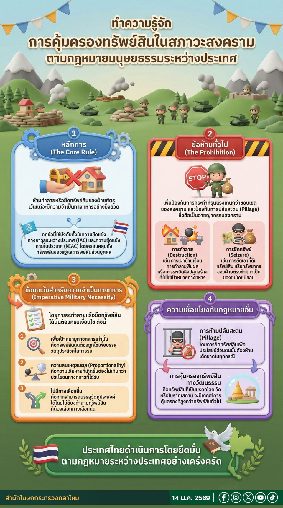 วันที่ 15 ม.ค.69 สำนักโฆษกกระทรวงกลาโหม ระบุว่า ทำความรู้จัก...การคุ้มครองทรัพย์สินในสภาวะสงคราม ตามกฎหมายมนุษยธรรมระหว่างประเทศกฎเกณฑ์ข้อที่ 50 (Rule 50) จากกฎหมายมนุษยธรรมระหว่างประเทศ (IHL) ของ ICRC มุ่งคุ้มครองทรัพย์สินในสภาวะสงคราม สรุปได้ดังนี้