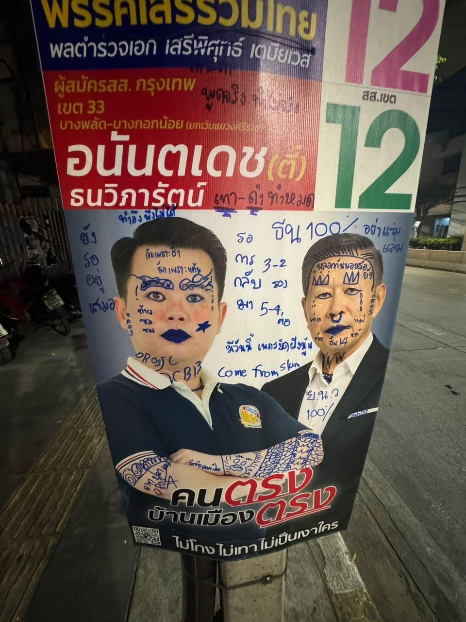 วันที่ 16 ม.ค.69 พล.ต.อ.เสรีพิศุทธ์ เตมียเวส หัวหน้าพรรคเสรีรวมไทย โพสต์เฟซบุ๊กเป็นภาพป้ายหาเสียงของตนกับ นายอนันตเดช ธนวิภารัตน์ ผู้สมัคร สส.กทม.เขต 33 พรรคเสรีรวมไทย ซึ่งมีมือดีนำปากกาเมจิกเขียนทับในลักษณะล้อเลียน พร้อมระบุข้อความว่า "ทำไปเพื่อ?…อยากเห็นหน้าคนทำกันไหม?#คนตรงบ้านเมืองตรง #เสรีรวมไทยเบอร์12"